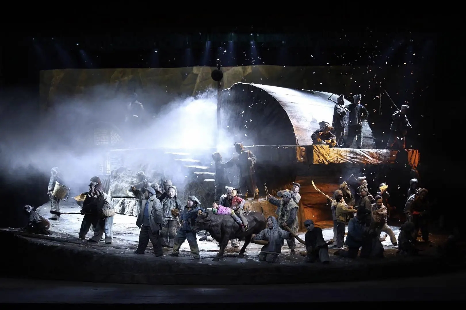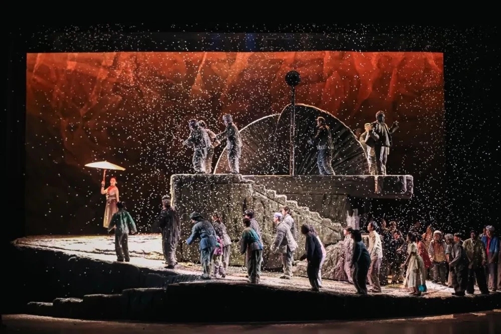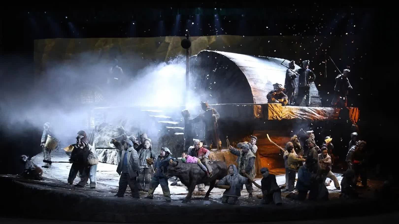 舞台上多次出現的大型「石碾」裝置,既是農家日常工具,也象徵「時代的碾壓」,是一種隱喻性的設計亮點,與石碾融為一體的還有山坡、鄉間小路和窯洞,連同極具地方質感的道具布設整體充分還原了陝北高原的風情地貌。