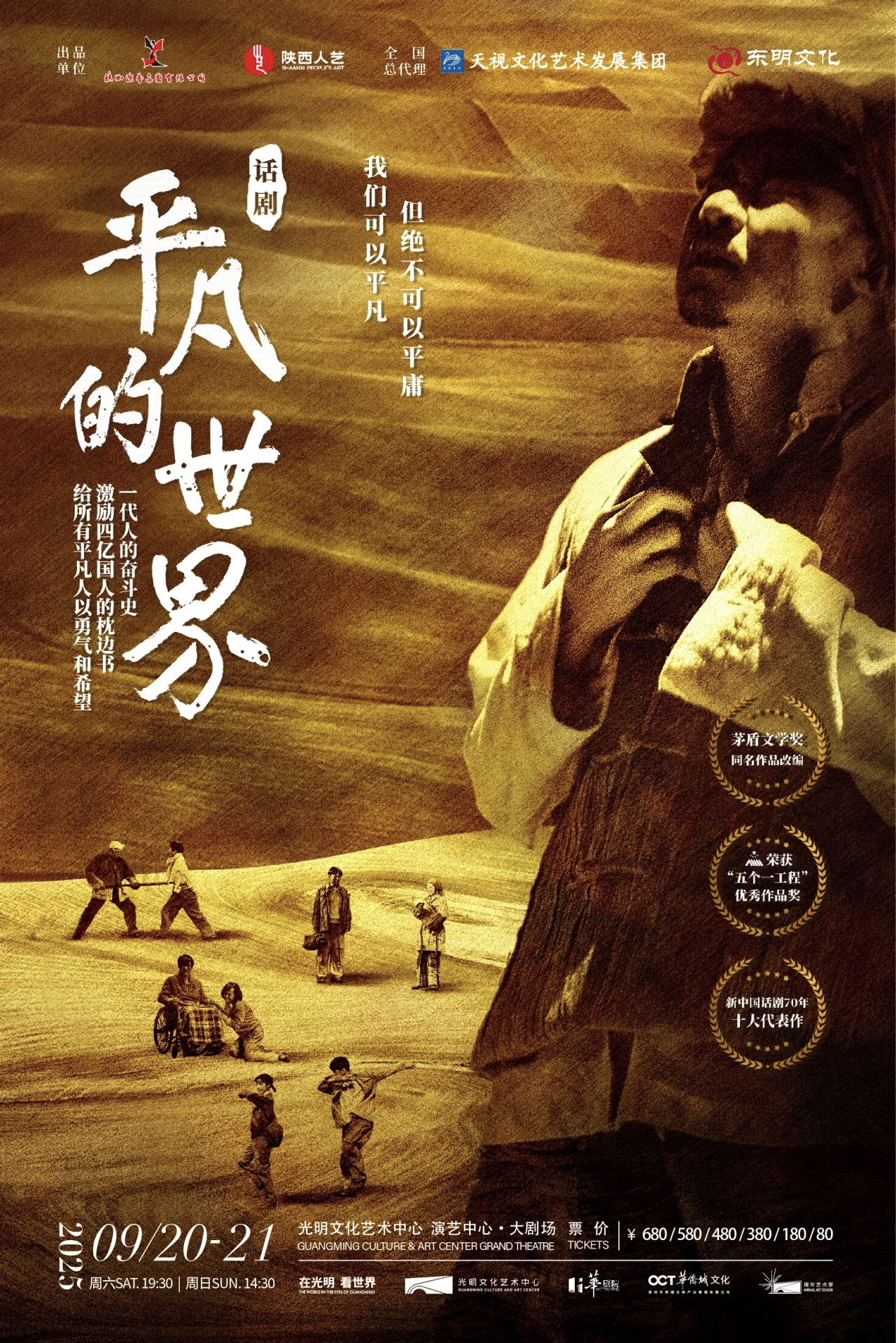 話劇《平凡的世界》改編自路遙先生「茅盾文學獎」同名小說。全景式地展現了七八十年代陝北地區普通人在大時代歷史進程中平凡而又曲折的人生道路,圍繞孫少安、孫少平兩兄弟的人生命運展開,並打造了一系列真實動人的人物群像,每個人物都代表着一個時代群體,飽含生命的苦澀與尊嚴。