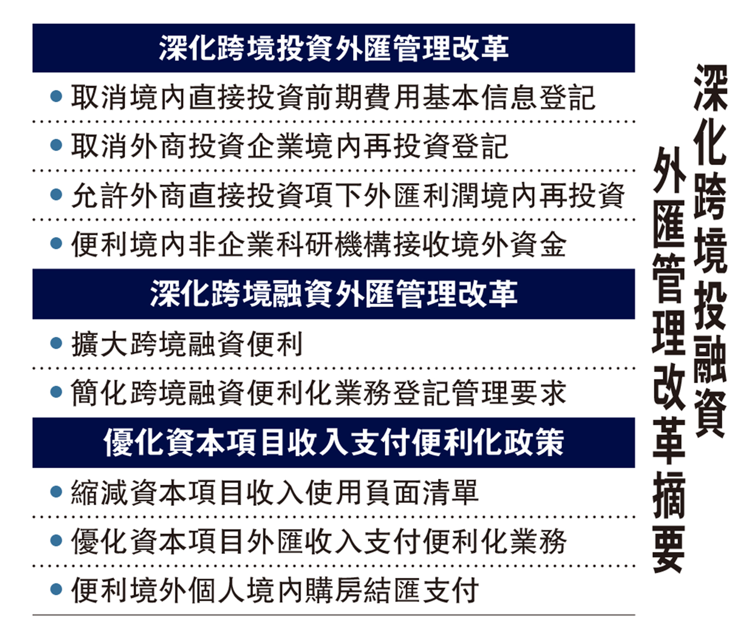 在深化跨境投資外匯管理改革方面,允許外商投資企業以外匯資本金及其結匯所得人民幣資金開展境內再投資,被投資企業或股權出讓方無需辦理接收境內再投資基本信息登記及變更登記,境內再投資資金可以直接劃至相關賬戶。並允許外商直接投資項下外匯利潤在境內再投資。