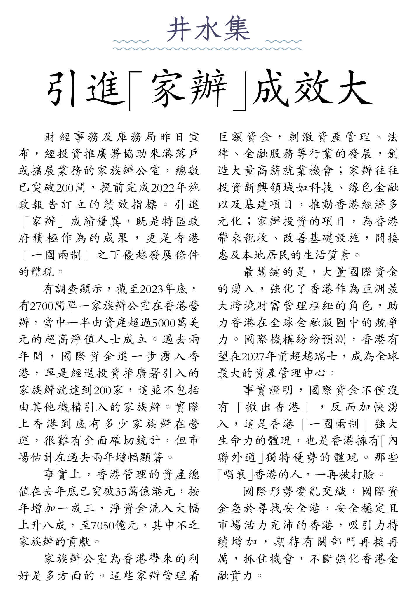 財經事務及庫務局昨日宣布,經投資推廣署協助來港落戶或擴展業務的家族辦公室,總數已突破200間,提前完成2022年施政報告訂立的績效指標。引進「家辦」成績優異,既是特區政府積極作為的成果,更是香港「一國兩制」之下優越發展條件的體現。
