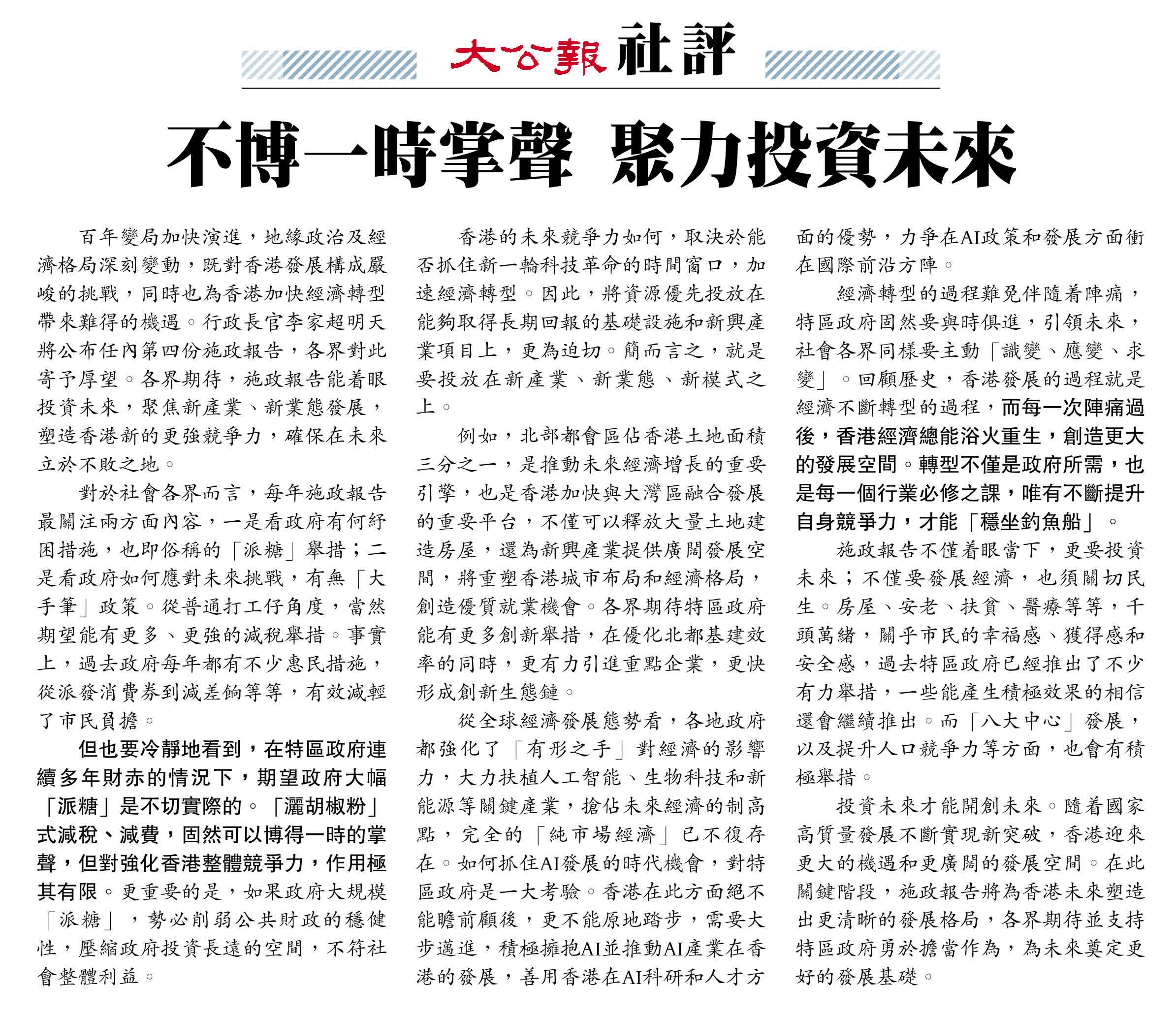投資未來才能開創未來。隨着國家高質量發展不斷實現新突破,香港迎來更大的機遇和更廣闊的發展空間。在此關鍵階段,施政報告將為香港未來塑造出更清晰的發展格局,各界期待並支持特區政府勇於擔當作為,為未來奠定更好的發展基礎。