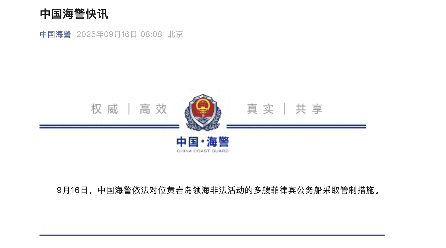據「中國海警」微信公眾號消息,9月16日,中國海警依法對位黃岩島領海非法活動的多艘菲律賓公務船採取管制措施。