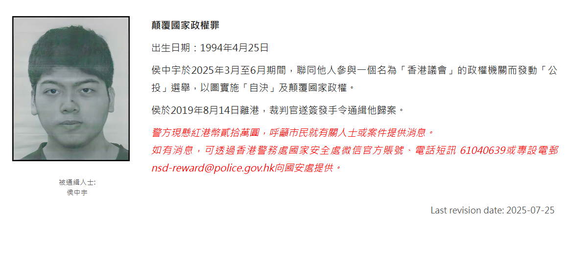 侯中宇涉犯「顛覆國家政權罪」,2025年3月至6月期間,侯中宇聯同他人參與一個名為「香港議會」的政權機關而發動「公投」選舉,以圖實施「自決」及顛覆國家政權。侯中宇於2019年8月14日離港,裁判官遂簽發手令通緝他歸案。