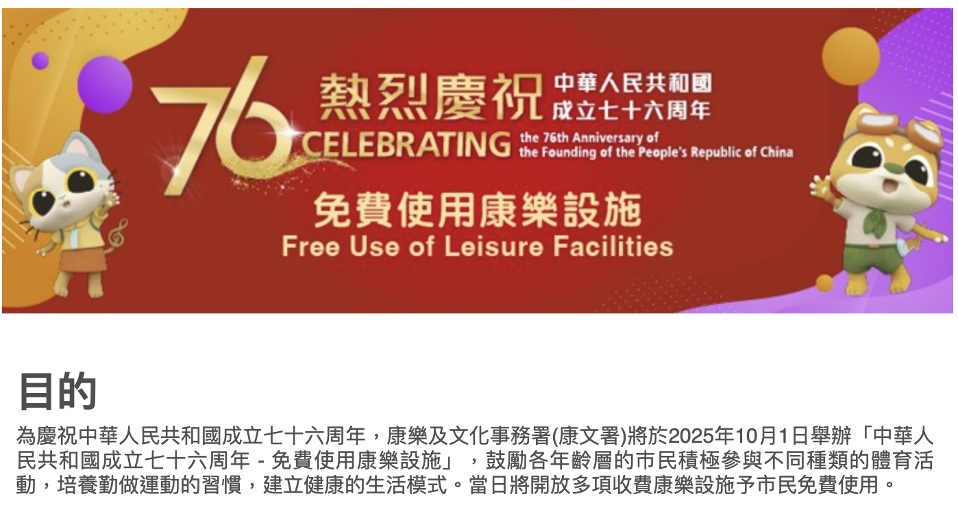 大公文匯全媒體報道,為慶祝中華人民共和國成立76周年,康文署將於10月1日開放多項收費康樂及文化設施予市民免費使用。詳情如下: