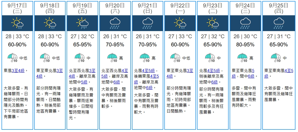 其中,本周後期靠近廣東沿岸的潛在風暴,整體威力較弱。天文台「地球天氣」頁面所見,該低壓系統能否形成熱帶氣旋本身亦有變數,且即使形成,強度亦較低。天文台「九天天氣」中,預計本周六(20日)吹北至西北風4至5級,離岸及高地間中6級,是該潛在風暴最接近香港的時間。