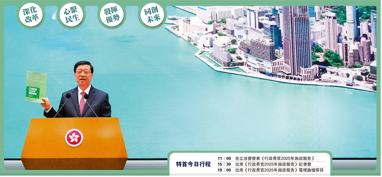 (大公報記者 義昊)行政長官李家超將於今日發表任內第四份施政報告,報告以綠色為封面顏色,主題是「深化改革 心繫民生 發揮優勢 同創未來」。李家超昨日出席行政會議前表示,施政報告涵蓋短、中、長期政策,主要圍繞經濟和民生,體現他過去多年的施政理念。李家超感謝提供意見的市民和組織,他表示,施政報告發表後,他將與團隊前往不同機構解說,希望大家支持施政報告,政府將致力落實施政報告理念。