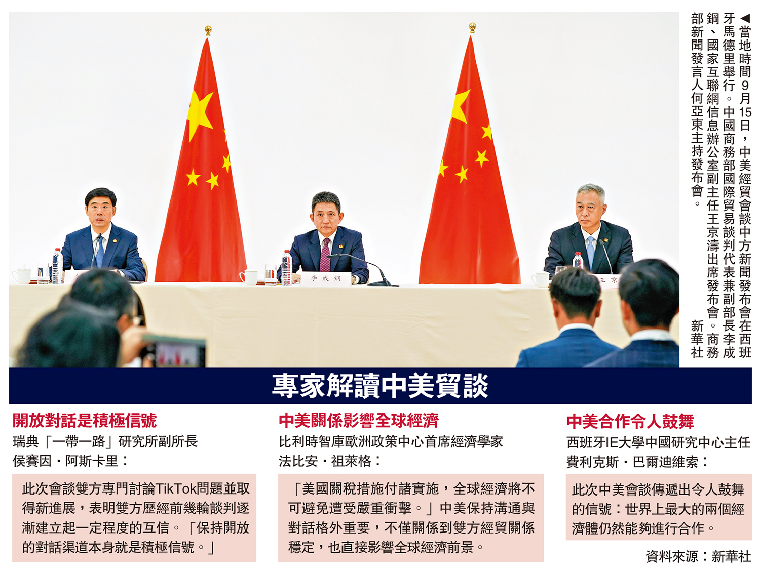 (大公報 記者 朱燁 北京報道)當地時間9月14日至15日,中美雙方經貿團隊在西班牙馬德里舉行會談。在會談結束後中方代表團舉行的新聞發布會上,中國商務部國際貿易談判代表兼副部長李成鋼表示,中方將堅決維護國家利益和中資企業合法權益,依法依規開展技術出口審批。雙方團隊將繼續保持密切溝通,就相關成果文件細節進行磋商,並各自履行國內批准程序。