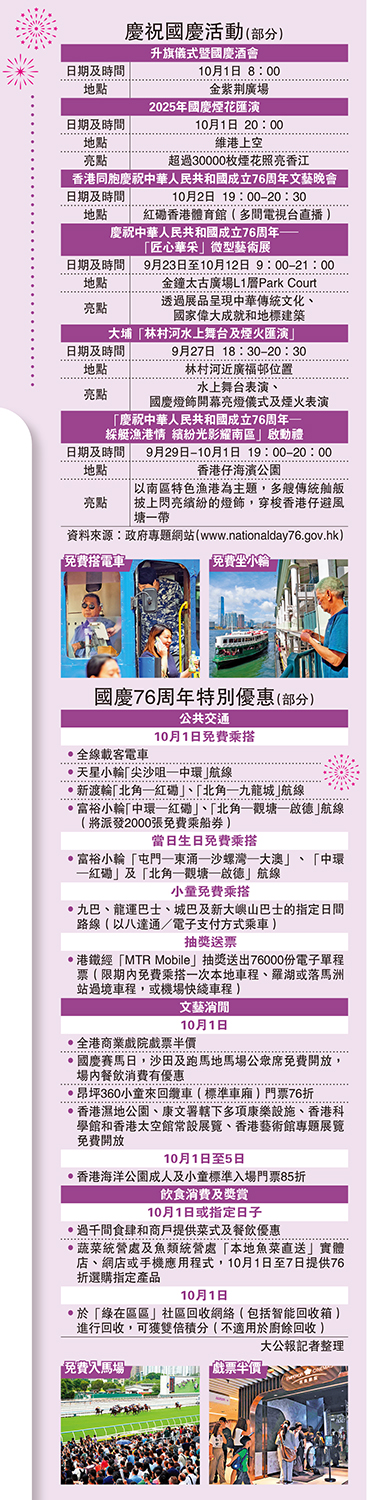 (大公報 記者 易曉彤)行政長官李家超昨日宣布,為慶祝中華人民共和國成立76周年,特區政府與社會各界籌辦一系列豐富多彩的慶祝活動及特別優惠,涵蓋匯演、文化藝術活動、休閒康樂、展覽表演、交通飲食消費等方面。國慶當日維港上空會有大型煙花匯演;電車及多條渡輪航線免費、港鐵送出7.6萬張電子單程票;康文署轄下多項康樂設施免費;還有過千間食肆和商戶提供菜式和餐飲優惠。