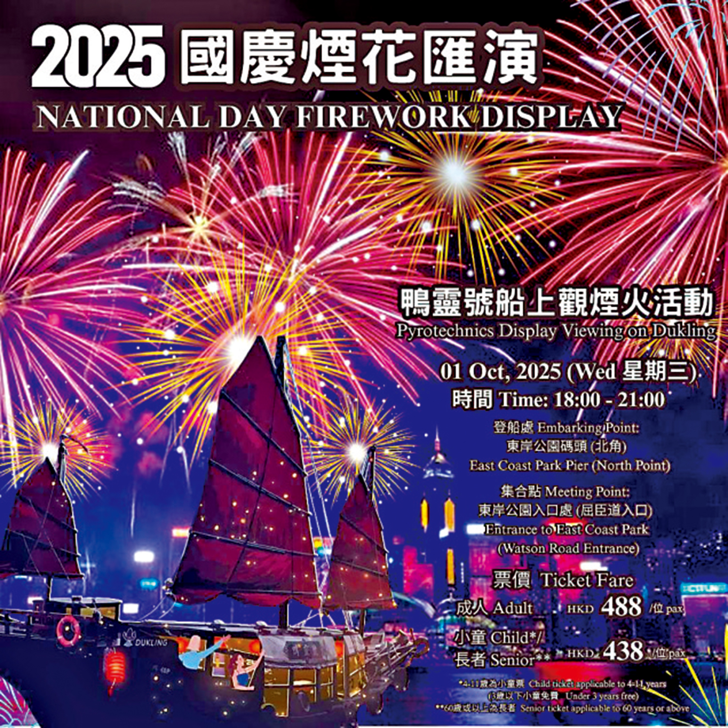 由中式帆船改裝成觀光船的鴨靈號,將於國慶日提供觀賞煙花服務,根據網頁顯示,截至昨晚9時只餘下10個名額,乘客當日傍晚6時在東岸公園入口處集合,6時15分在碼頭登船,煙花完結後的9時落船,歷時三小時。