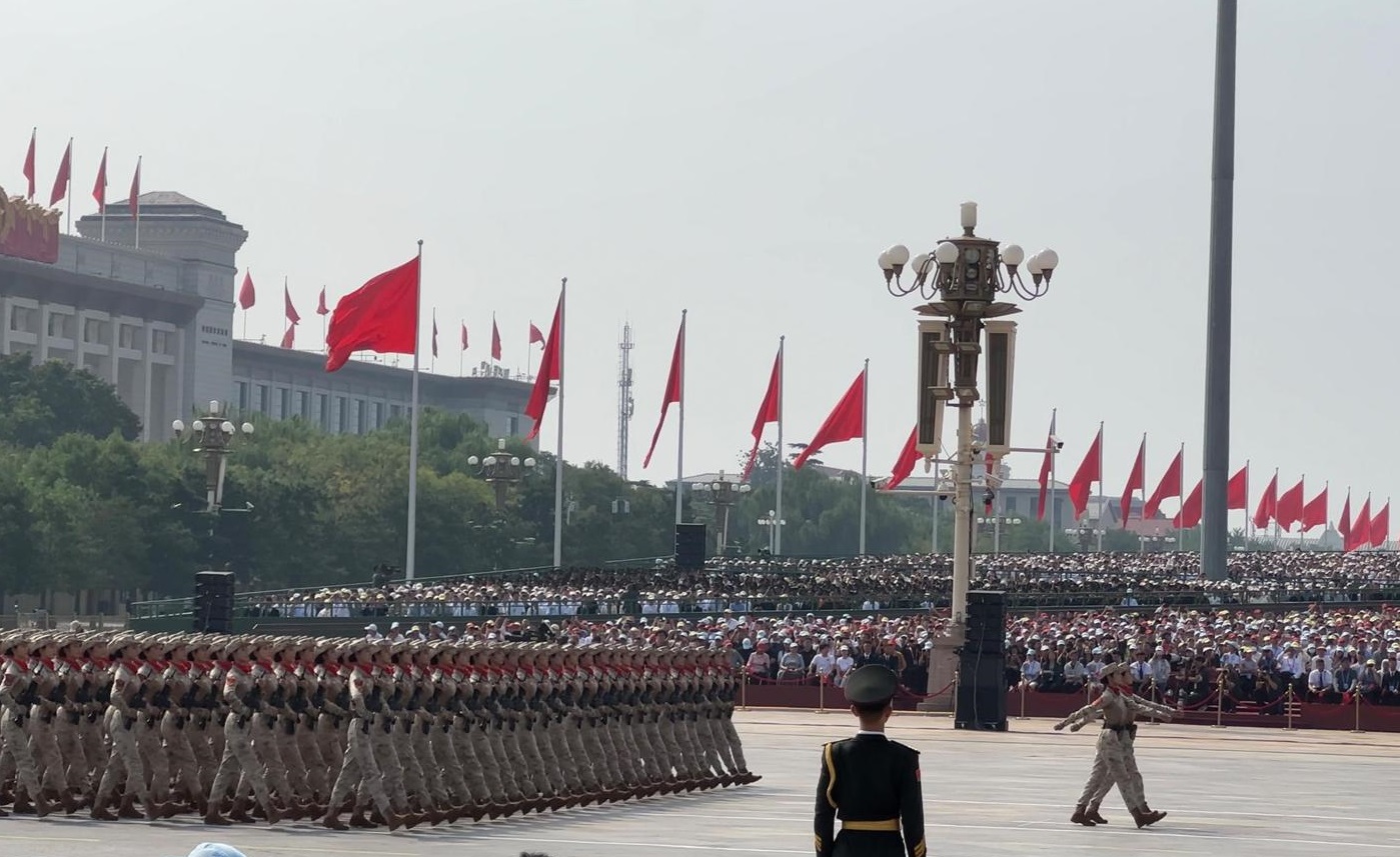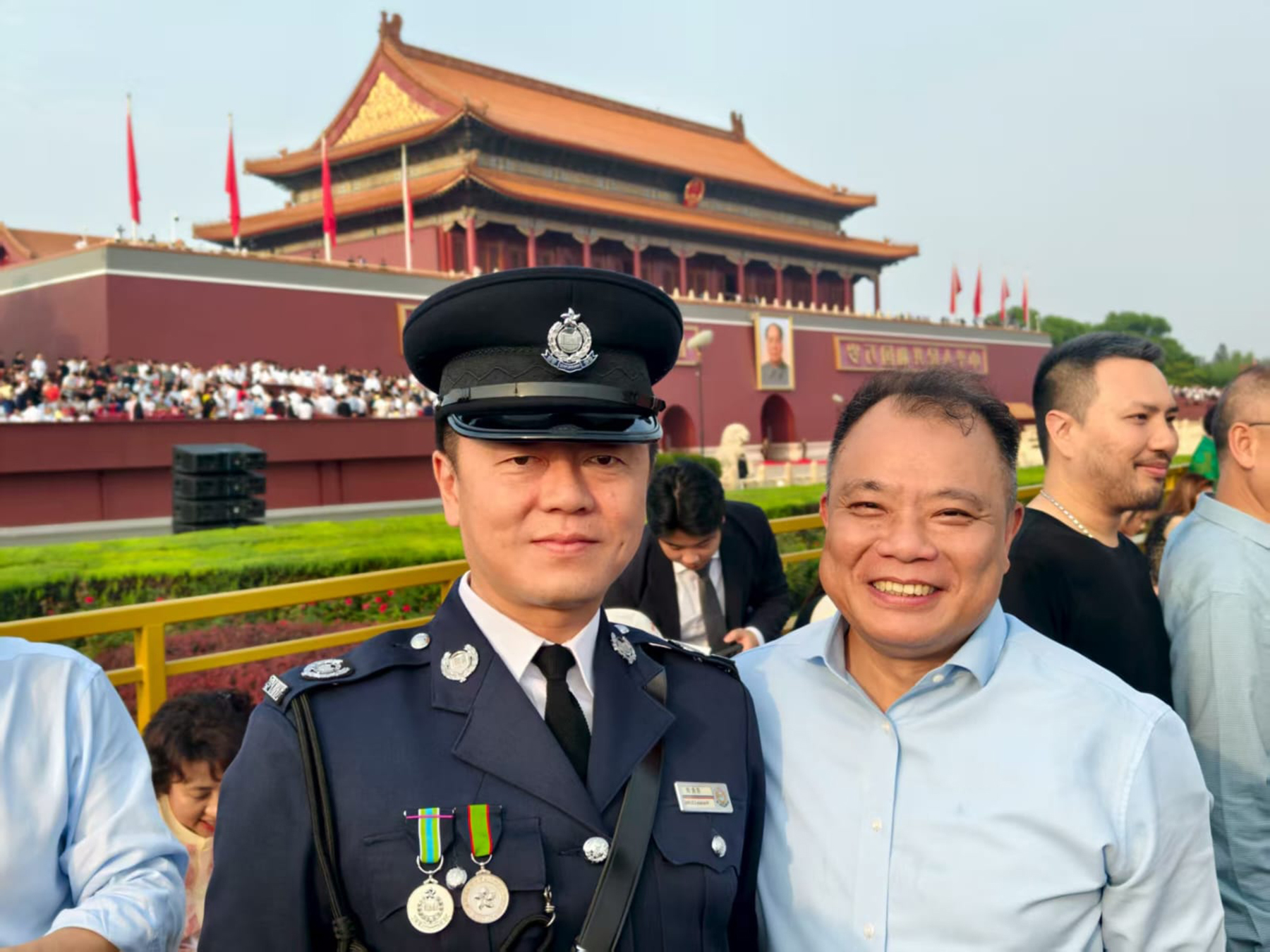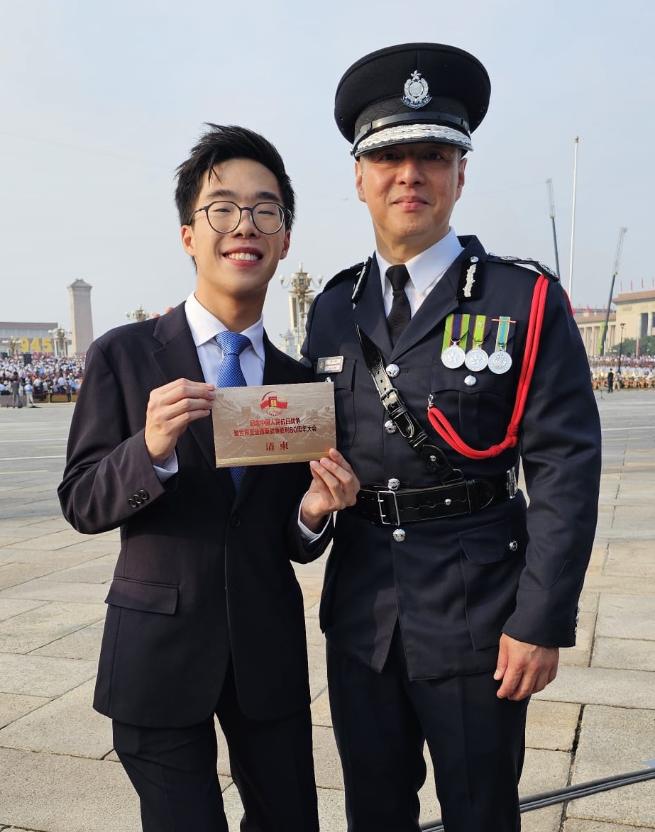 九月三日,警務處處長周一鳴率領一行十五人的警隊代表團,隨香港特別行政區代表團前往北京,參加紀念中國人民抗日戰爭暨世界反法西斯戰爭勝利八十周年大會(九三閱兵)。代表團中,包括「70後」新任香港警察隊員佐級協會主席、警署警長梁俊傑,以及「00後」警隊暑期實習生曾梓軒。兩人至今仍對閱兵場景記憶猶新:徒步方隊以整齊劃一的正步通過觀禮台,無論從哪個角度觀看,隊伍始終保持筆直;即使閉上雙眼,也能聽到鏗鏘有力的步伐聲,展現出中國軍人的威武氣勢。