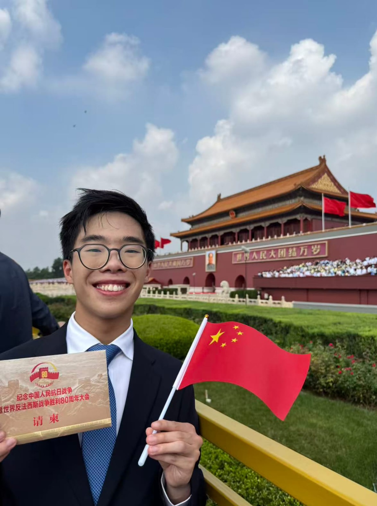 曾梓軒表示,這次閱兵是一堂難忘的愛國教育課:「親眼看到導彈發射車、坦克和裝甲車從面前駛過,那種震撼難以言喻。我們這一代雖然沒有經歷戰亂,但通過新聞深知世界並不太平。慶幸自己生在一個和平的國度,沒有強大的國家實力,就無法守護今天的太平——弱國無外交。」