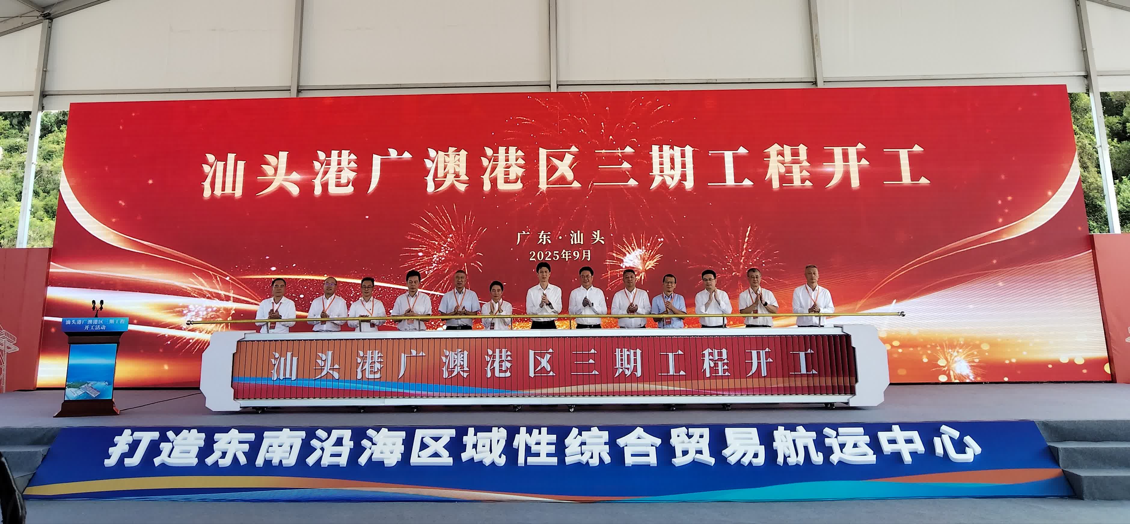 今日(17日),備受矚目的國家「十四五」規劃102項重大工程項目——招商局汕頭港廣澳港區三期工程開工。該項目擬新建12個泊位,包括2個10萬噸級和1個7萬噸級集裝箱泊位、7個2萬—5萬噸級通用泊位、2個5萬噸級滾裝泊位,同時配套建設相關設施及廣梅汕鐵路汕頭站至汕頭廣澳港區鐵路廣澳站場陸域形成工程。