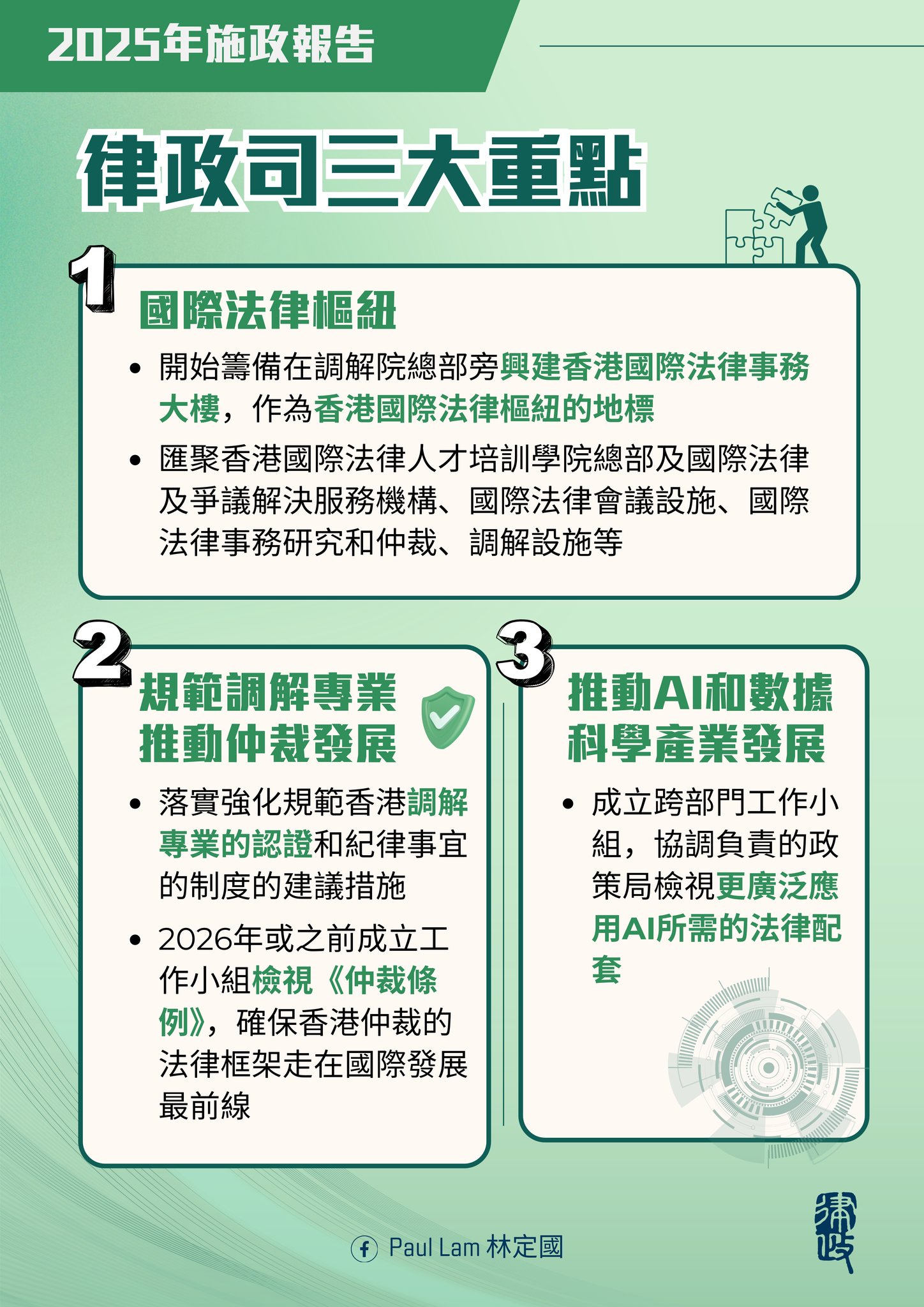 第二,推動調解文化及仲裁發展。林定國表示,將落實強化規範香港調解專業的認證和紀律事宜制度的建議措施;在2026年或之前成立工作小組檢視《仲裁條例》,以確保香港仲裁的法律框架走在國際發展的最前線。