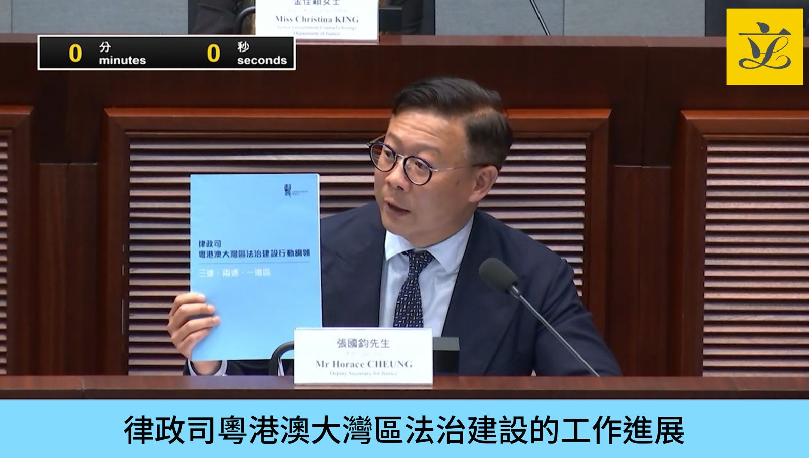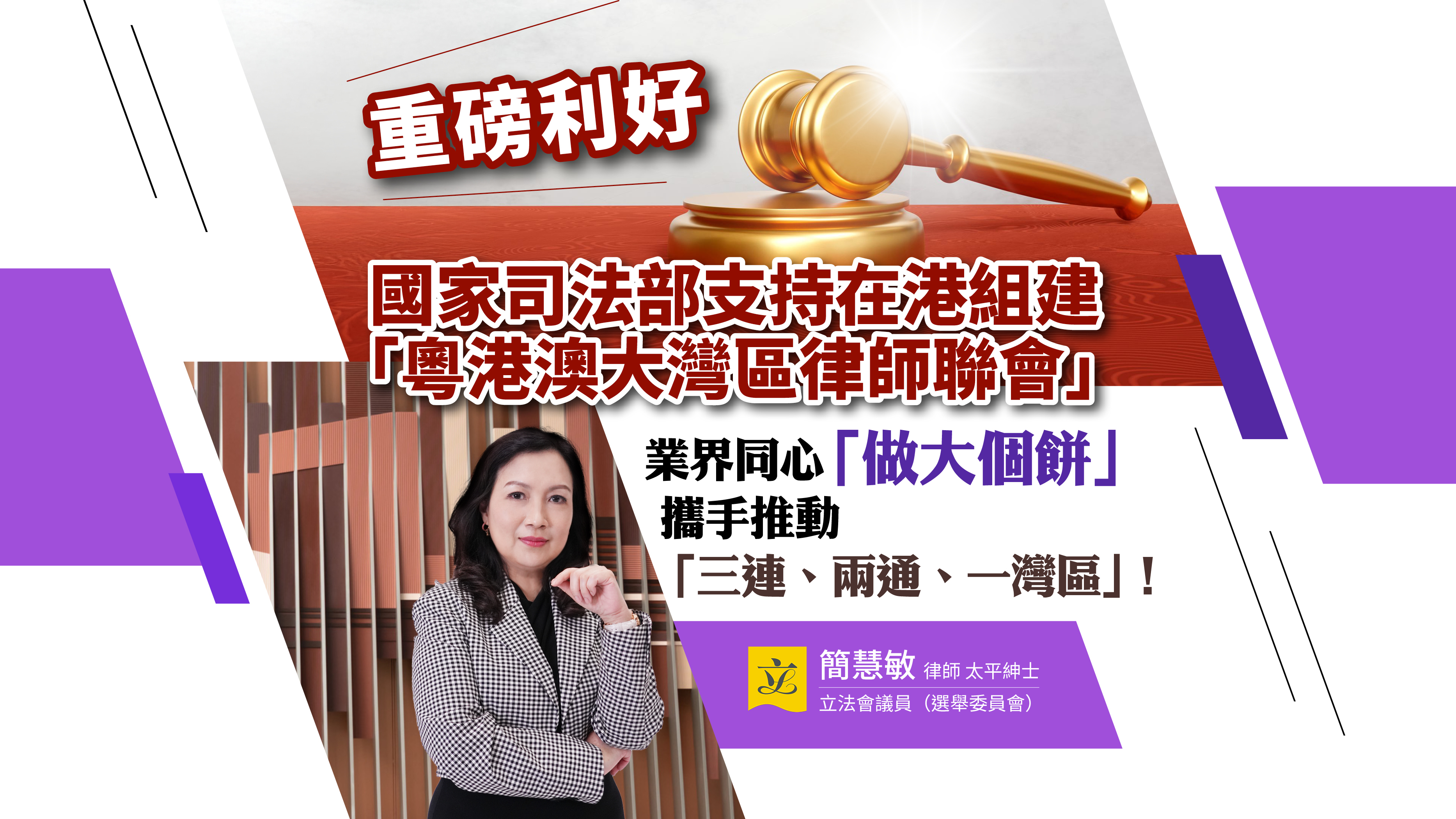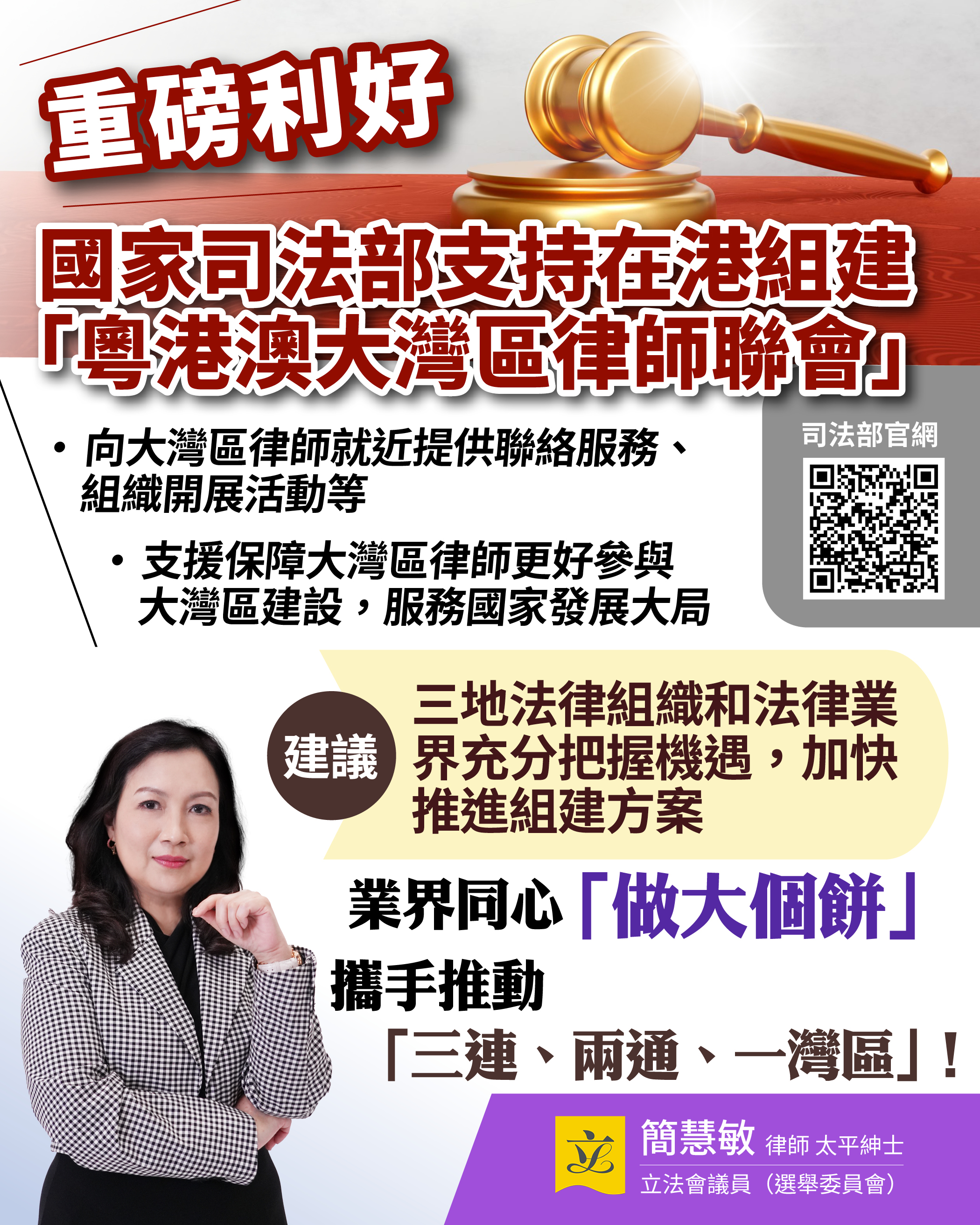 自律政司公布《粵港澳大灣區法治建設行動綱領》以來,筆者一直密切關注大灣區法治建設的各項進展,並多次在司法及法律事務委員會會議上提出建議,指出律政司應積極爭取內地部委的支持及配合,充分發揮香港在「一國兩制」下的普通法制度優勢,為本港律師業界開拓更多發展機會,助力大灣區法治建設實現高質量發展。