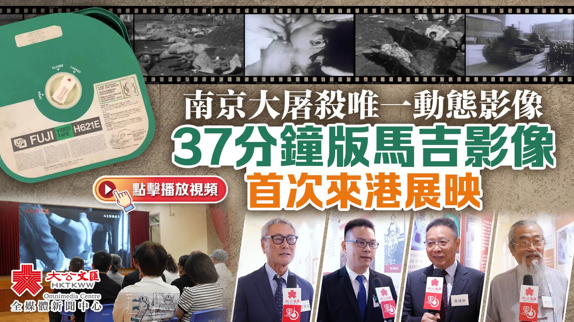 (大公文匯網 記者 陳旻 香港報道)「這是南京眾多水塘中的一個,許多人被日本兵殺死後又被扔進了池塘,大約在12月26日,這裏有40多人被殺,有一具漂起來的浮屍可以看到,他們被殺時雙臂被捆綁着。」9月17日,在香港愛國教育支援中心「鑒往知來·復興中華——紀念中國人民抗日戰爭勝利暨台灣光復八十周年史料展」開展儀式上,88年前南京大屠殺期間由美國牧師約翰·馬吉用16毫米攝像機秘密拍攝的揭露日軍暴行的唯一動態影像37分鐘版首次在香港放映,全場近百名觀眾屏息觀看。在目前已發現的各種馬吉影像版本中,37分鐘版馬吉影像反映侵華日軍南京大屠殺暴行最為全面、內容最為豐富。一幀幀黑白畫面,真實還原日本軍國主義在侵華戰爭中犯下的殘暴罪行。