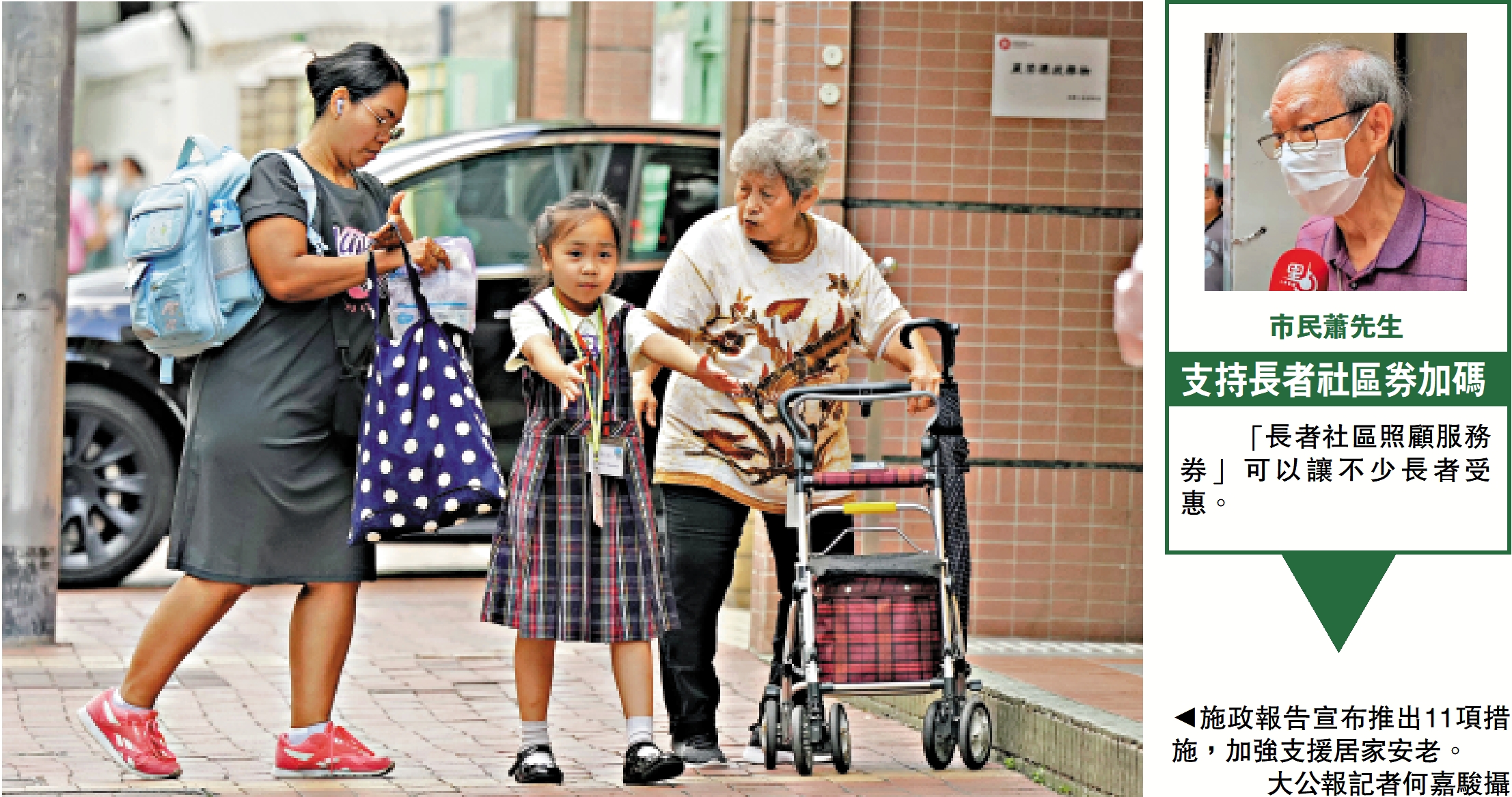 (大公報 記者 肖泓宇)面對人口老化,行政長官李家超昨日在施政報告宣布推出11項措施,加強支援居家安老,包括增設三間長者鄰舍中心、長者社區券與長者院舍券加碼。特區政府優化大灣區養老安排,今年底前推出試驗計劃,資助赴粵養老的綜援受助長者入住指定在粵安老院。