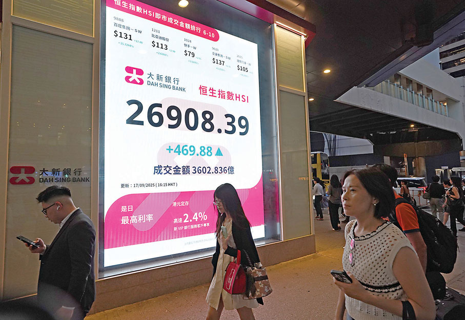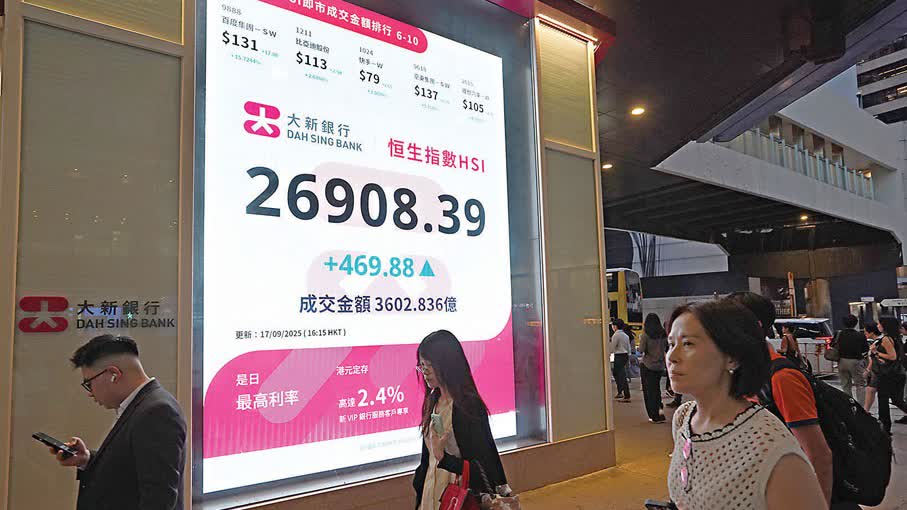 (香港文匯報 記者 岑健樂)行政長官李家超於2025年施政報告提及會持續強化香港股票市場、市場憧憬中美經貿關係有望緩和,及美國舉行議息會議後有很大機會減息,在多重利好消息帶動下,港股全日表現亮麗。恒指於午後升幅不斷擴大,一度高見26,936點,刷新年內最高紀錄,收報26,908點,升469點或1.78%,大市成交3,602億元。分析員認為,恒指於年內有望進一步上升,持續刷新年內新高。