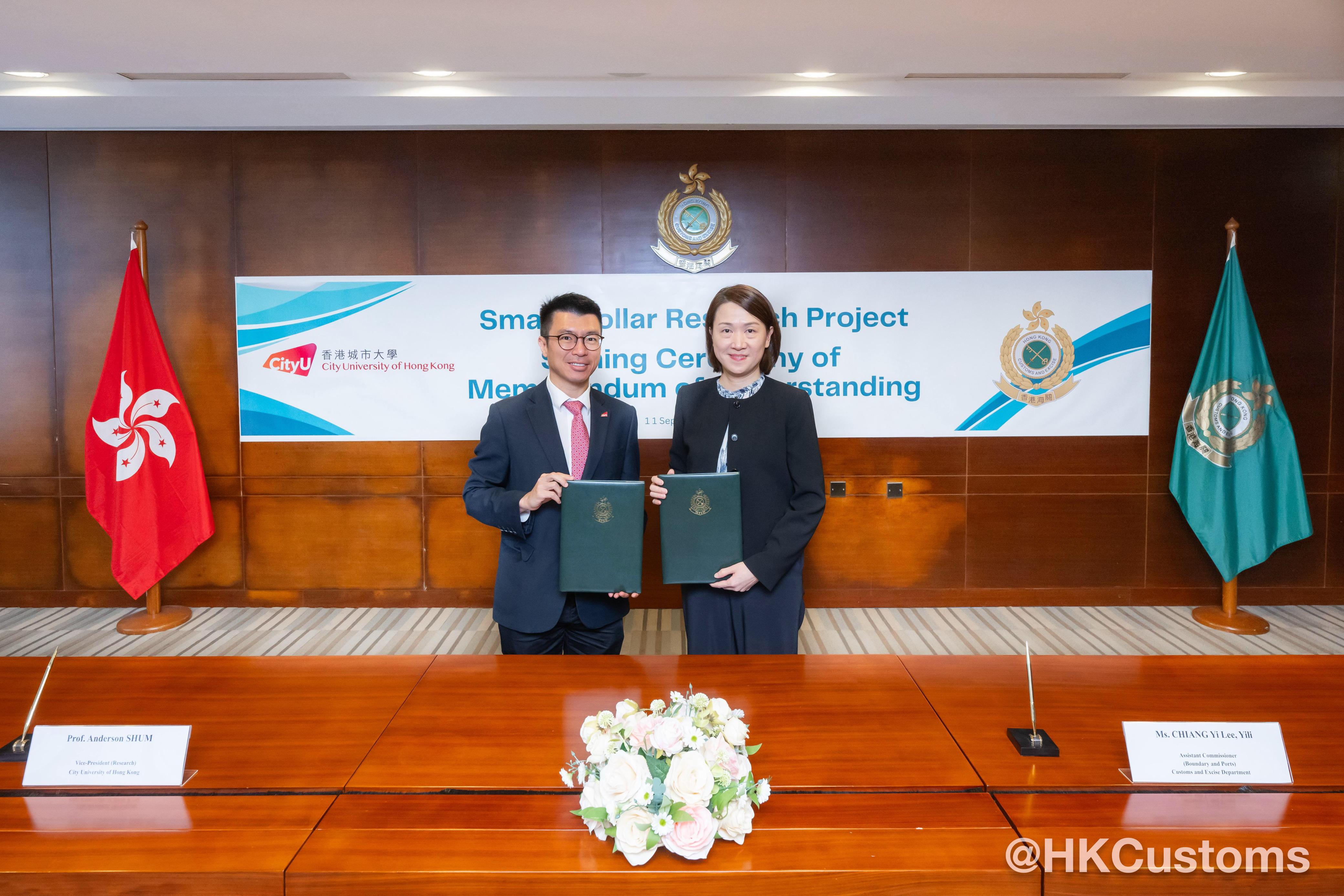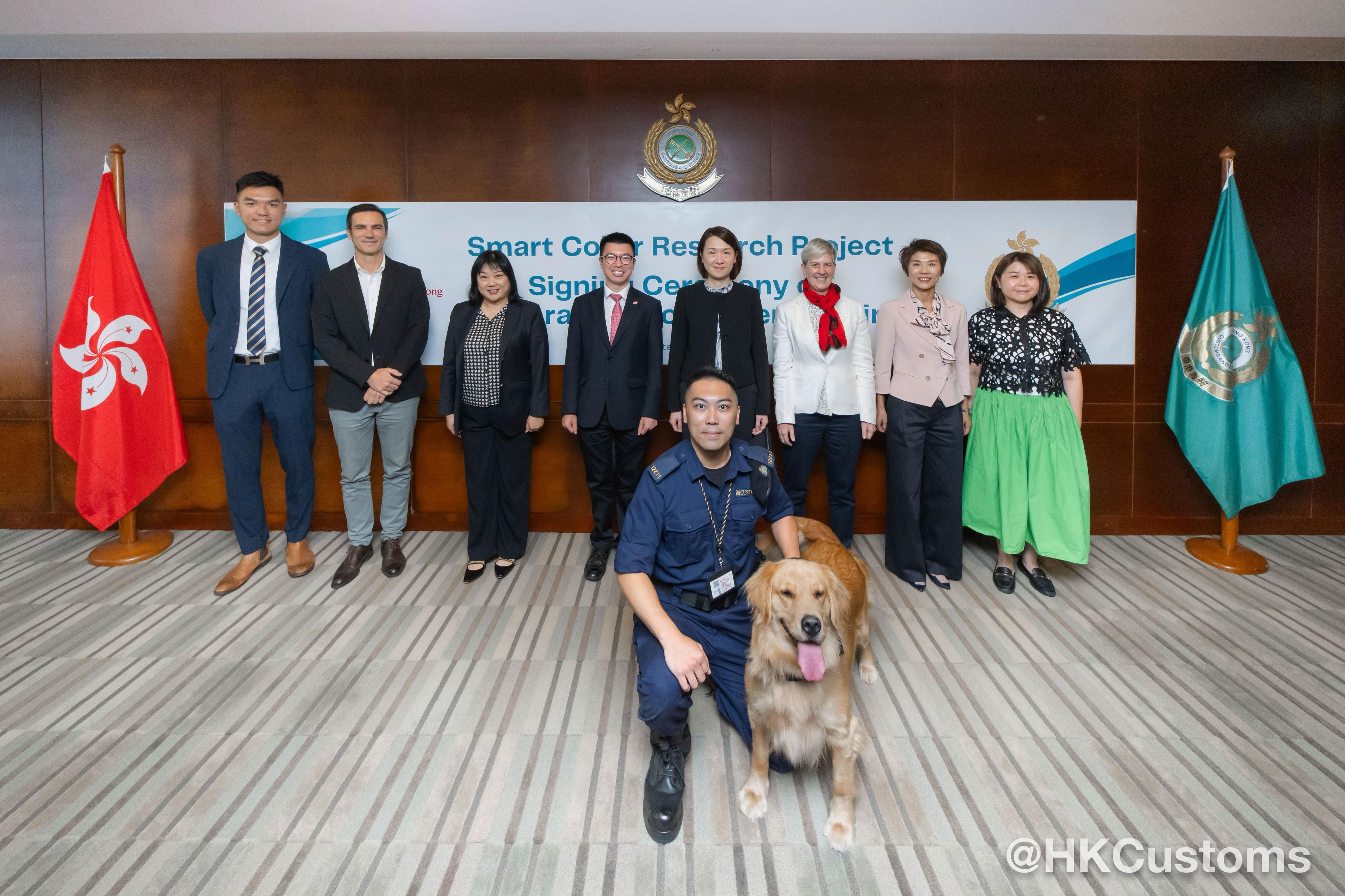 香港海關助理關長(邊境及港口)蔣依莉於九月十一日在香港海關總部大樓與香港城市大學(城大)簽署合作備忘錄,透過智能頸圈的數據研究和分析提升搜查犬的執法成效。