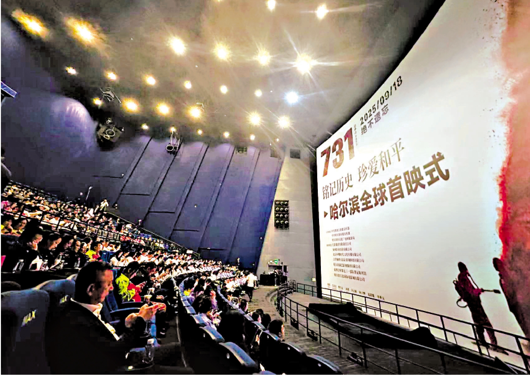 首映式現場座無虛席,電影《731》的總出品人、總監製莊嚴,總製片人張望,導演趙林山,主演姜武、李乃文、孫茜、林子燁、李善玉等主創人員,同黑龍江社會各界代表,共同觀看了影片並進行了深入交流,通過光影連接,深刻體會歷史之重、和平之重。