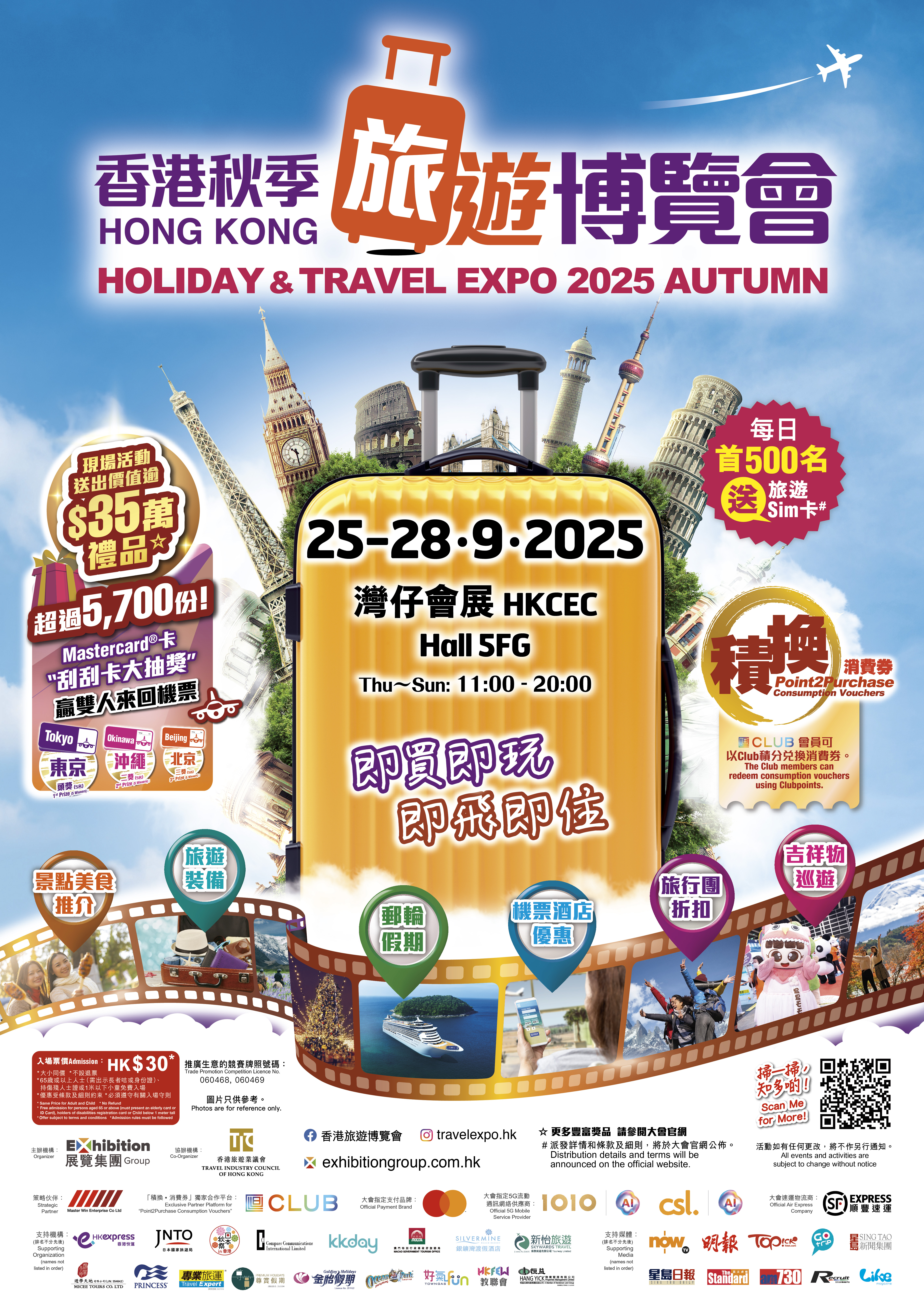 大公文匯全媒體報道,展覽集團自2024年開始舉辦「香港旅遊博覽會」,而過去2月的「香港旅遊博覽會2025」入場人數再創新高,較去年博覽會增加27%,並廣受各界好評。為回應市民對一站式旅遊資訊及產品的熱熾需求,展覽集團宣布將於2025年9月25至28日假香港會議展覽中心展覽館5FG再次舉辦「香港秋季旅遊博覽會2025」,並由香港旅遊業議會協辦。