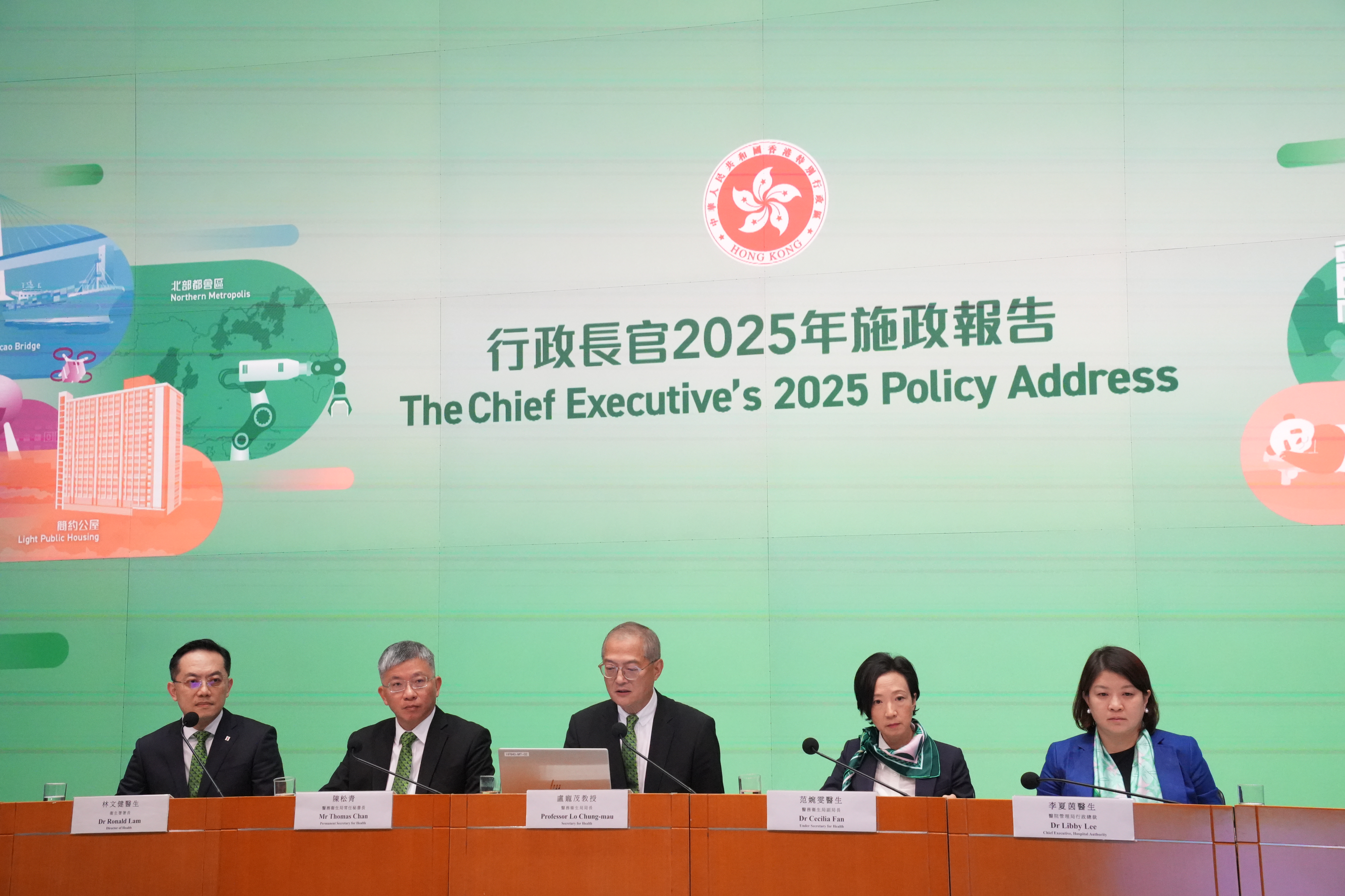 (大公文匯全媒體記者 劉鴻霖)新一份施政報告於昨日(17日)發表。醫務衞生局局長盧寵茂與衞生署署長林文健與今日(18日)下午一同出席記者會,詳解施政報告中醫療相關政策。