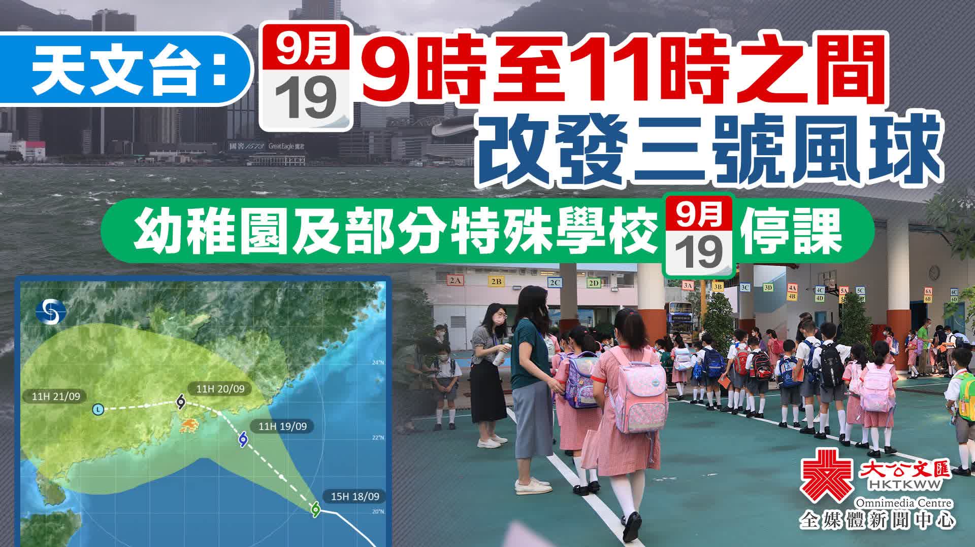 教育局公布,由於天文台會在明早9時至11時之間改發三號熱帶氣旋警告信號,幼稚園、肢體傷殘兒童學校及智障兒童學校明日停課。