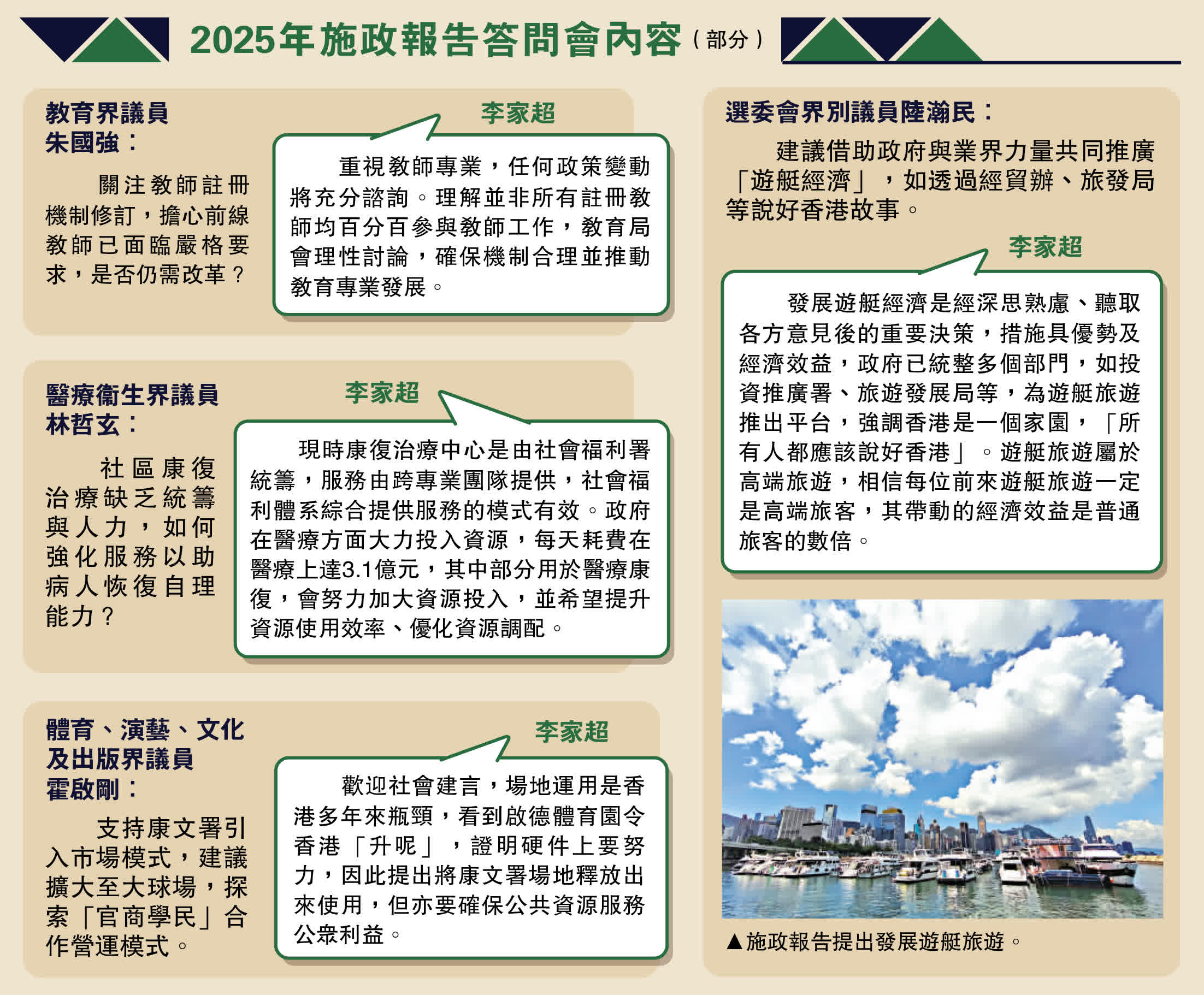 在問答環節,李家超與議員充分互動,共回答了13位議員提問。新界東南立法會議員李世榮指出,政府預留5億元開支推出照顧者措施,但關注資源如何用得到位。李家超回應說,支援照顧者對應對人口老化非常重要。他表示,政府極歡迎社會就資源運用優次提供建議,「如何用好它?如果有意見給我,無任歡迎,更是無言感激」。他同時指出,已責成相關政策局和部門建立需要照顧人士的資料庫,並感謝關愛隊及社會熱心人士提供支援。