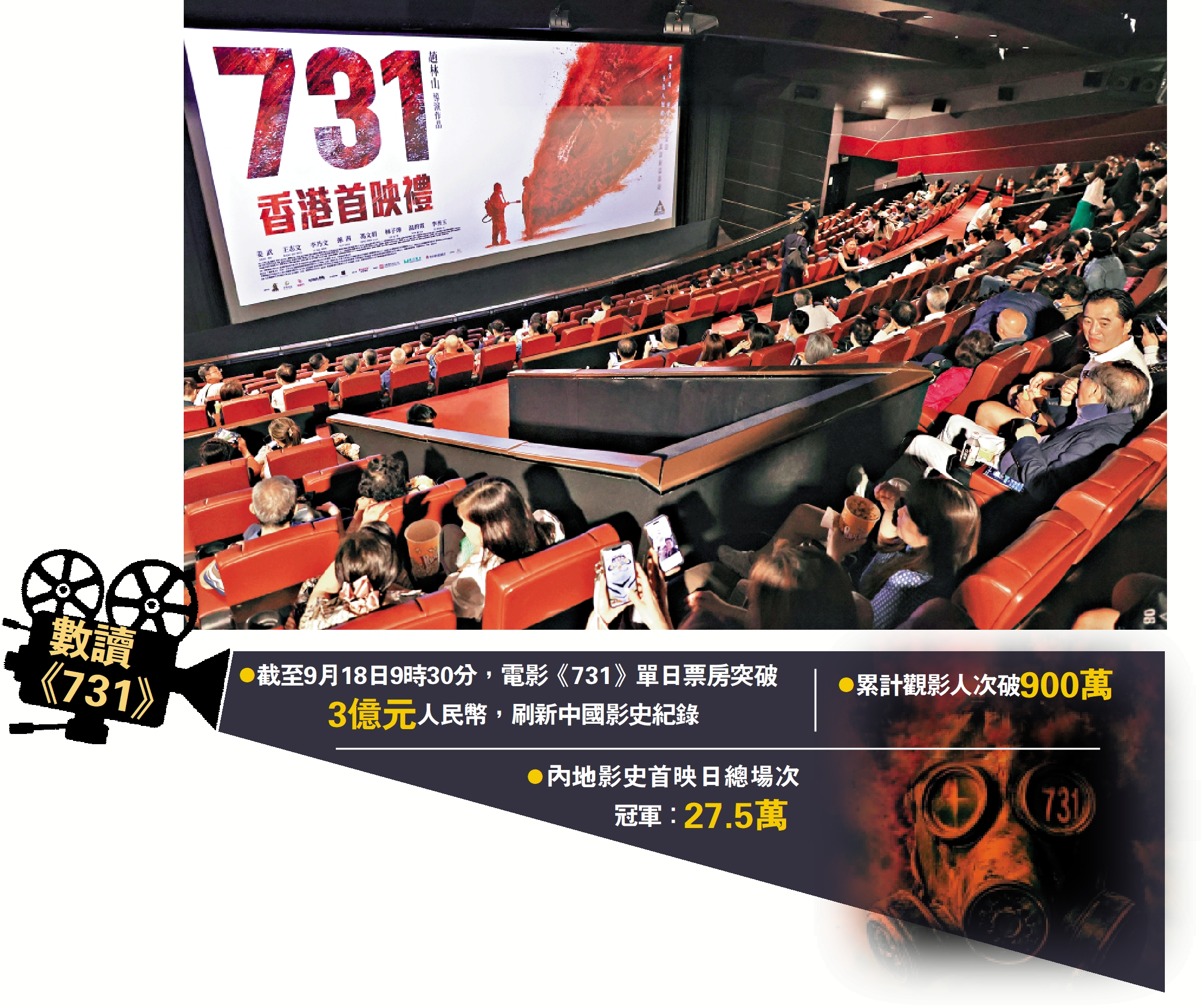 (大公報 記者 徐小惠、郭悅盈、顏琨、劉毅)以二戰時期侵華日軍第七三一部隊的反人類罪行為主線的電影《731》昨日(9月18日)正式在內地及港澳上映。本片在香港由銀都機構、洲立影片和東方影業聯手發行,於昨晚7點31分在銅鑼灣影藝戲院舉行首映禮。銀都機構總經理丁凱表示,9月18日是重要的歷史節點,「是特意選在今天在港澳同步上映的,就是一定想要在今天(公映)。」首映當日,港澳兩地55間戲院排片200多場,丁凱認為這既體現出聯合發行的團結才是力量,亦反映出港澳觀眾對電影的期待。截至昨晚9時半,電影《731》內地首日票房已超過3億元人民幣。