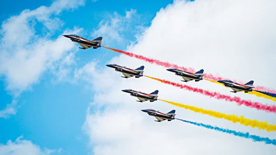 運油-20A蛇形機動、殲-20「鑽石隊形」亮相、轟-6雙機編隊通場……多型戰機勁舞藍天。