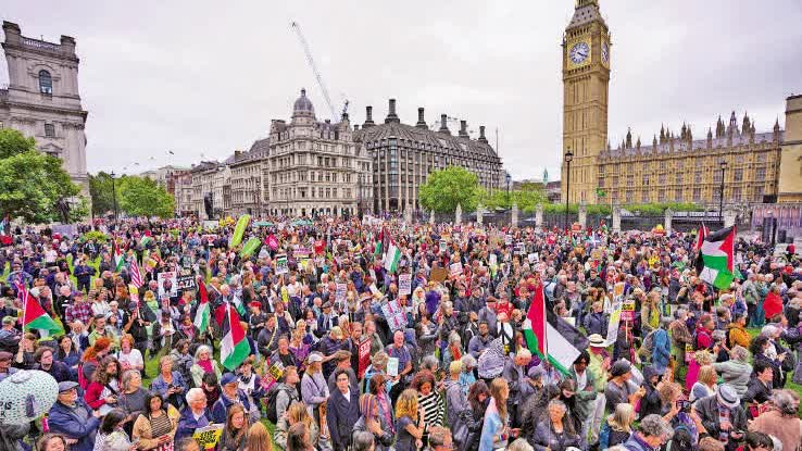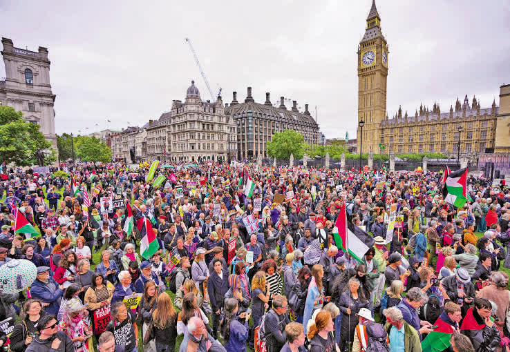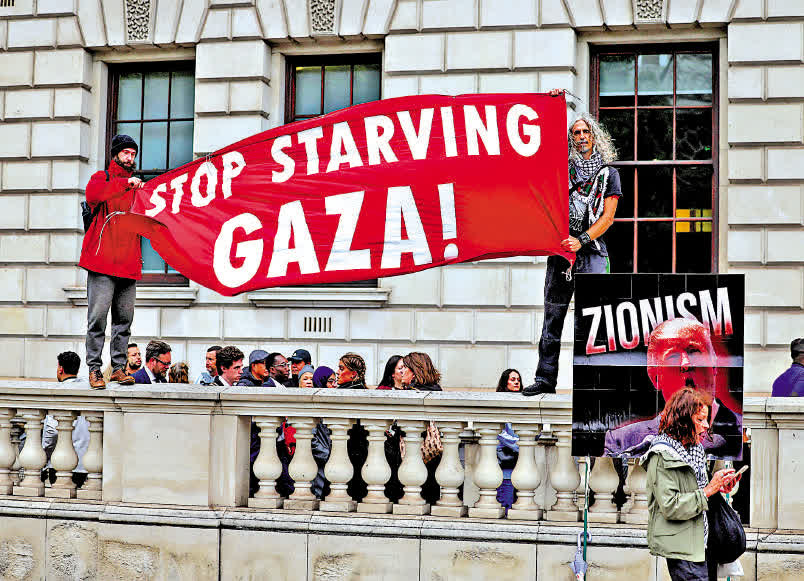 法國、澳洲、加拿大等多國近期無視美以施壓,紛紛宣布將承認巴勒斯坦國。聯合國一個調查委員會16日發布報告,認定以色列在加沙犯下種族滅絕罪。倫敦市長薩迪克·汗17日表示:「當我看到兒童捱餓的畫面,當我看到加沙醫療系統崩潰、物資短缺……我不可避免地得出這樣的結論:加沙正在發生種族滅絕。」當日,約5000人在倫敦遊行示威,反對特朗普關於巴以衝突、移民等問題的政策。一些示威者高舉寫着「阻止種族滅絕」的標語牌。