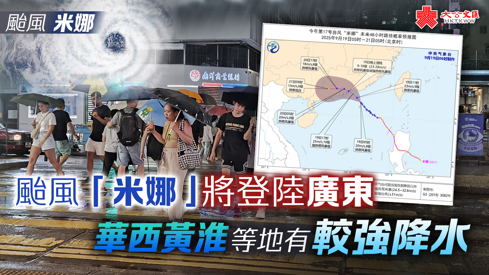 據中央氣象台網站消息,今年第17號颱風「米娜」(熱帶風暴級)的中心今天(19日)早晨5點鐘位於廣東省汕尾市南偏東方向約160公里的南海北部海面上,中心附近最大風力有8級(20米/秒),中心最低氣壓為995百帕。預計,「米娜」將以每小時10~15公里的速度向西北方向移動,強度逐漸增強,將於19日晚上在廣東汕尾至台山一帶沿海登陸(23~28米/秒,9~10級,熱帶風暴級或強熱帶風暴級),登陸後向偏西方向移動,強度逐漸減弱。