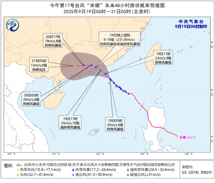 中央氣象台發布大風預報,19日08時至20日08時,南海北部和東部、台灣南部沿海、福建南部沿海、廣東沿海將有6-7級大風,陣風8-9級,其中,廣東中東部沿海、南海東北部的部分海域風力有8至10級,陣風11至12級。