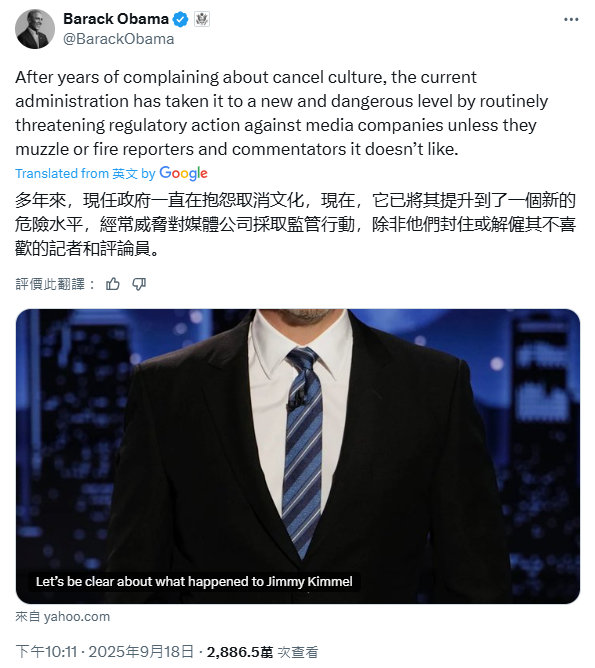 奧巴馬在社交平台寫道,特朗普政府這些年一直抱怨「取消文化」,但如今卻「經常威脅要對媒體公司採取監管行動,除非這些公司封殺或解僱其不喜歡的記者和評論員」。