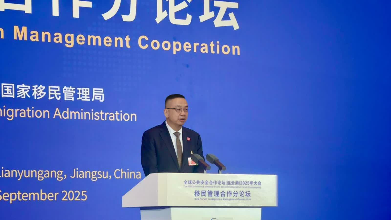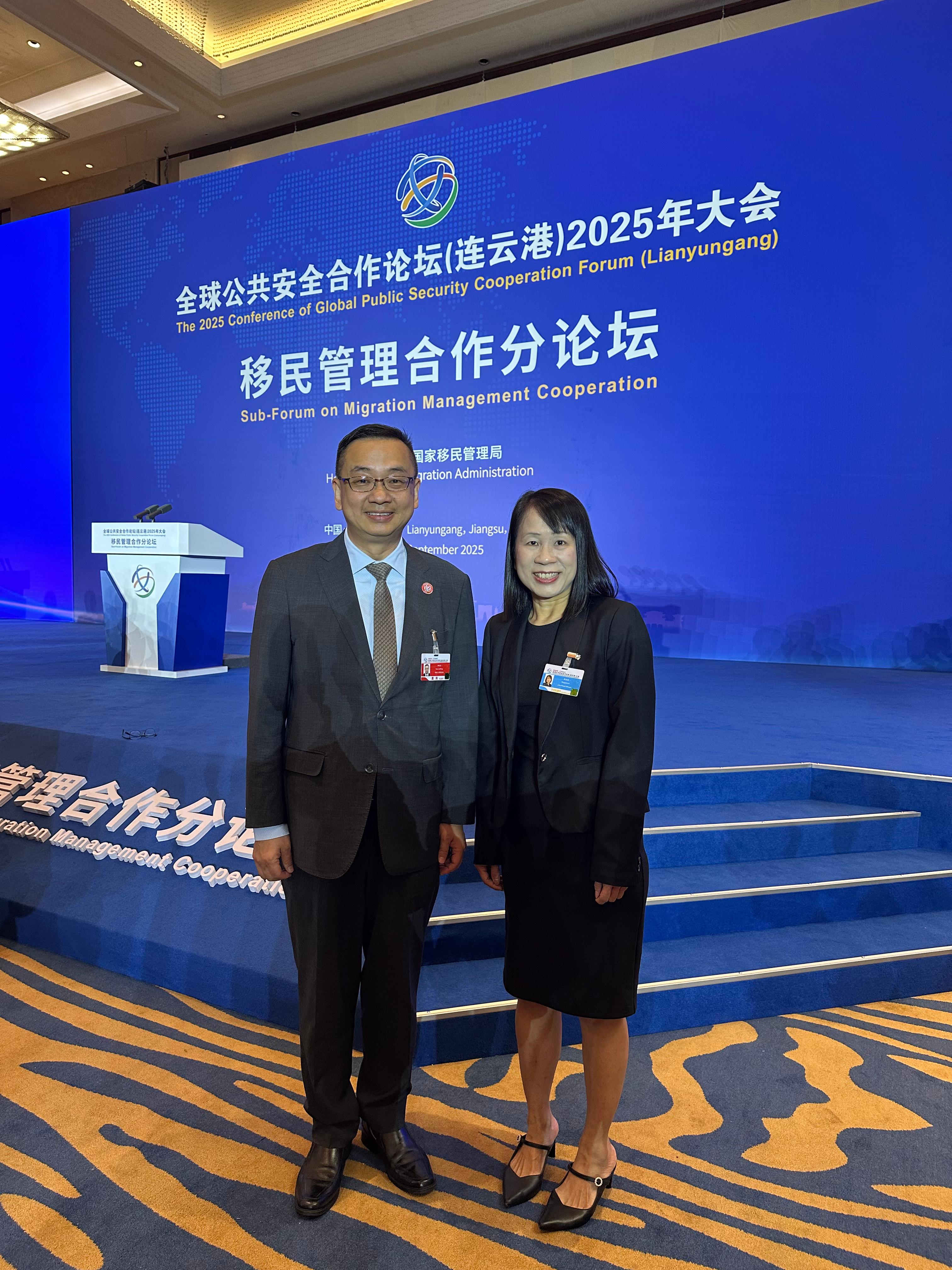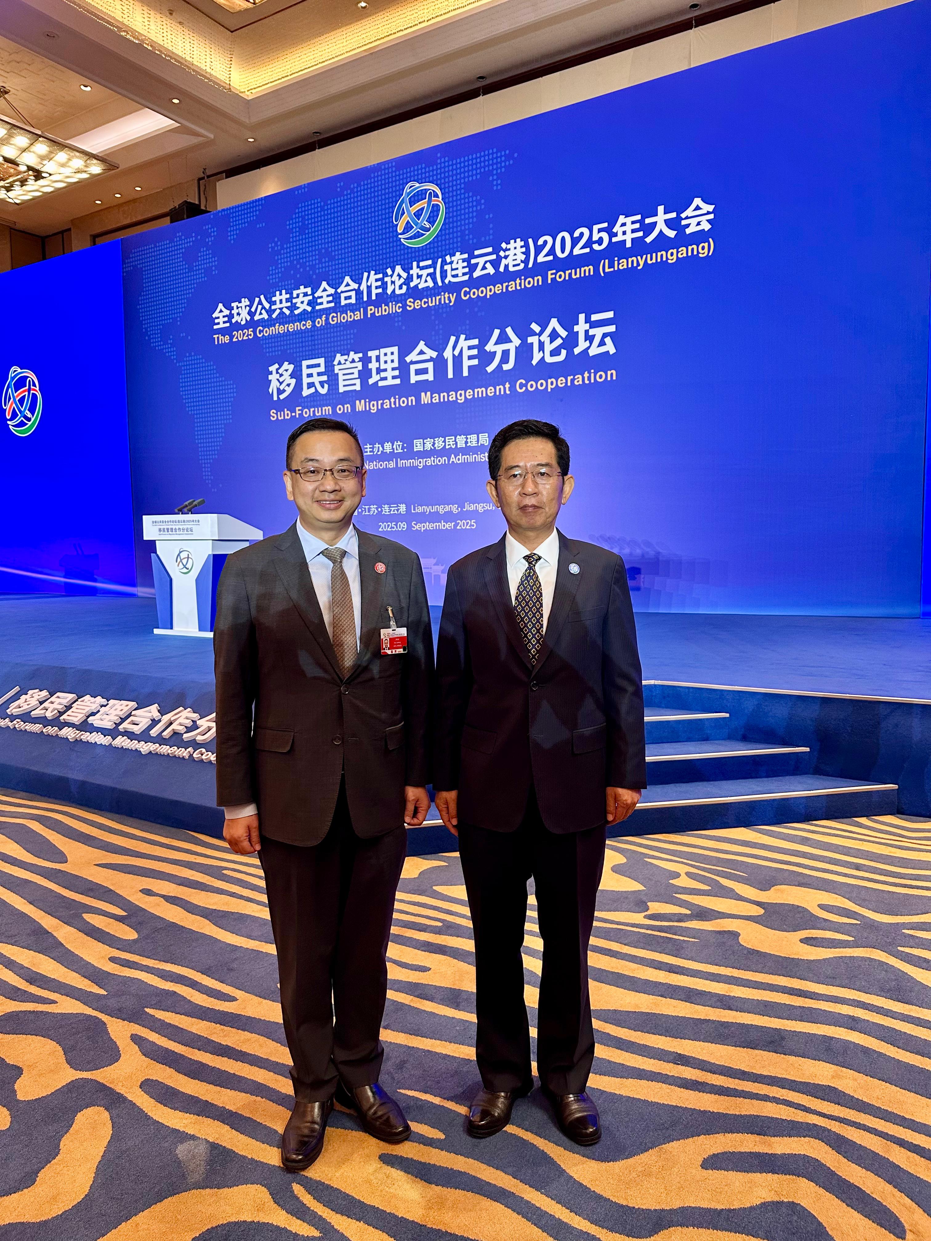 郭處長聯同樊助理處長於9月16日至18日率領代表團出席江蘇省連雲港市舉行的「全球公共安全合作論壇(連雲港)2025年大會」,以中國代表團成員身份參與主論壇、移民管理合作分論壇和區域移民治理政策研討會,與來自全球約120個國家、地區和國際組織近2000名嘉賓共同探討全球重要的公共安全議題。代表團成員在會上與多國執法機關、國際組織代表及專家學者,就出入境管理和吸引人才等多項議題進行深入交流。