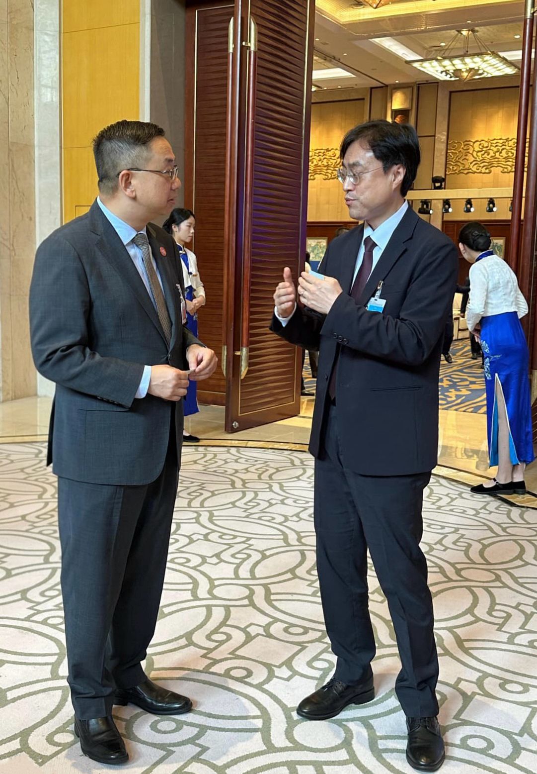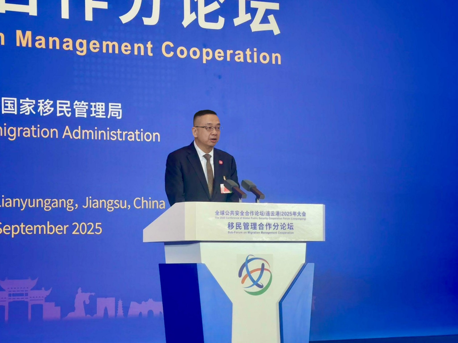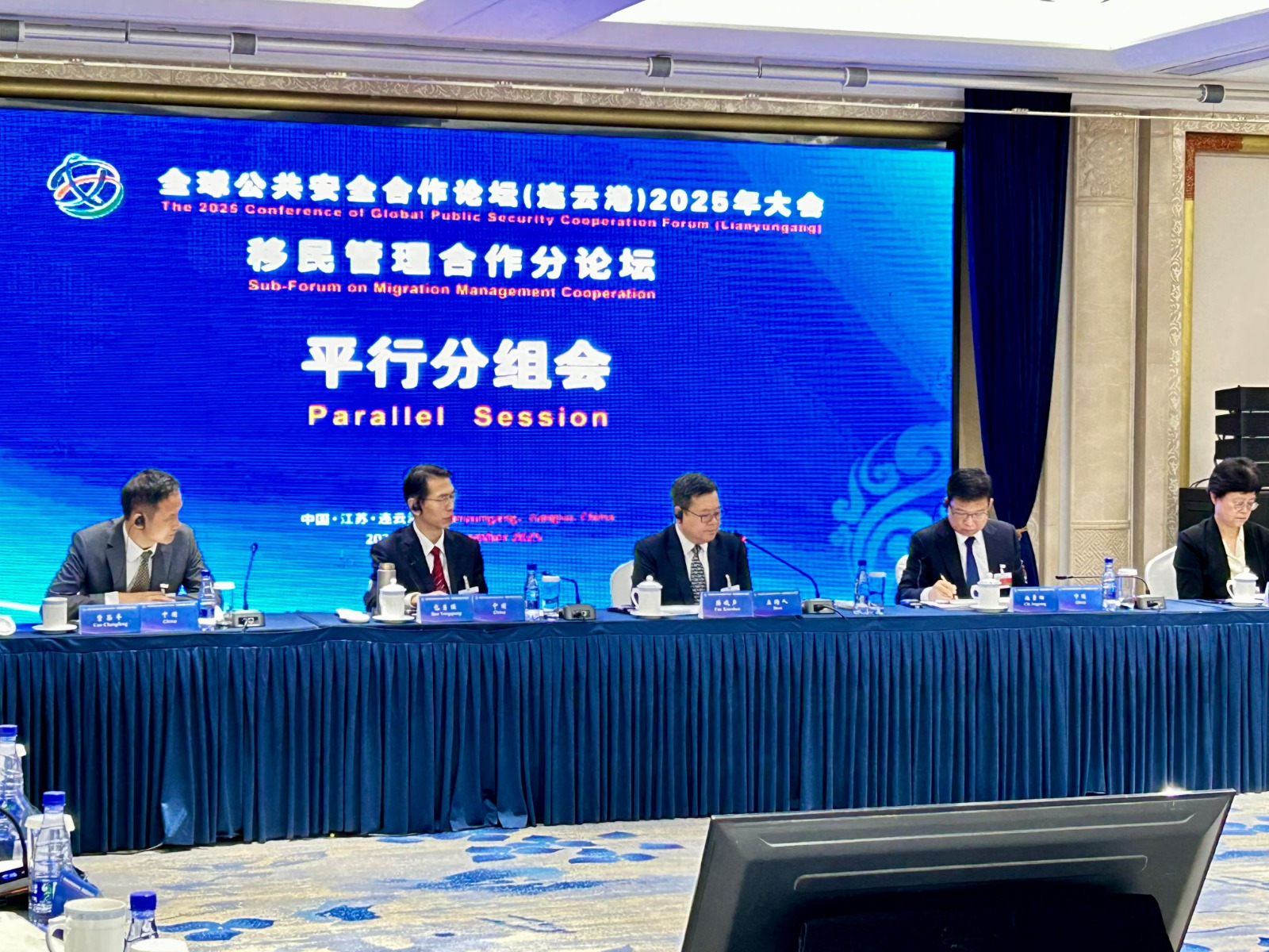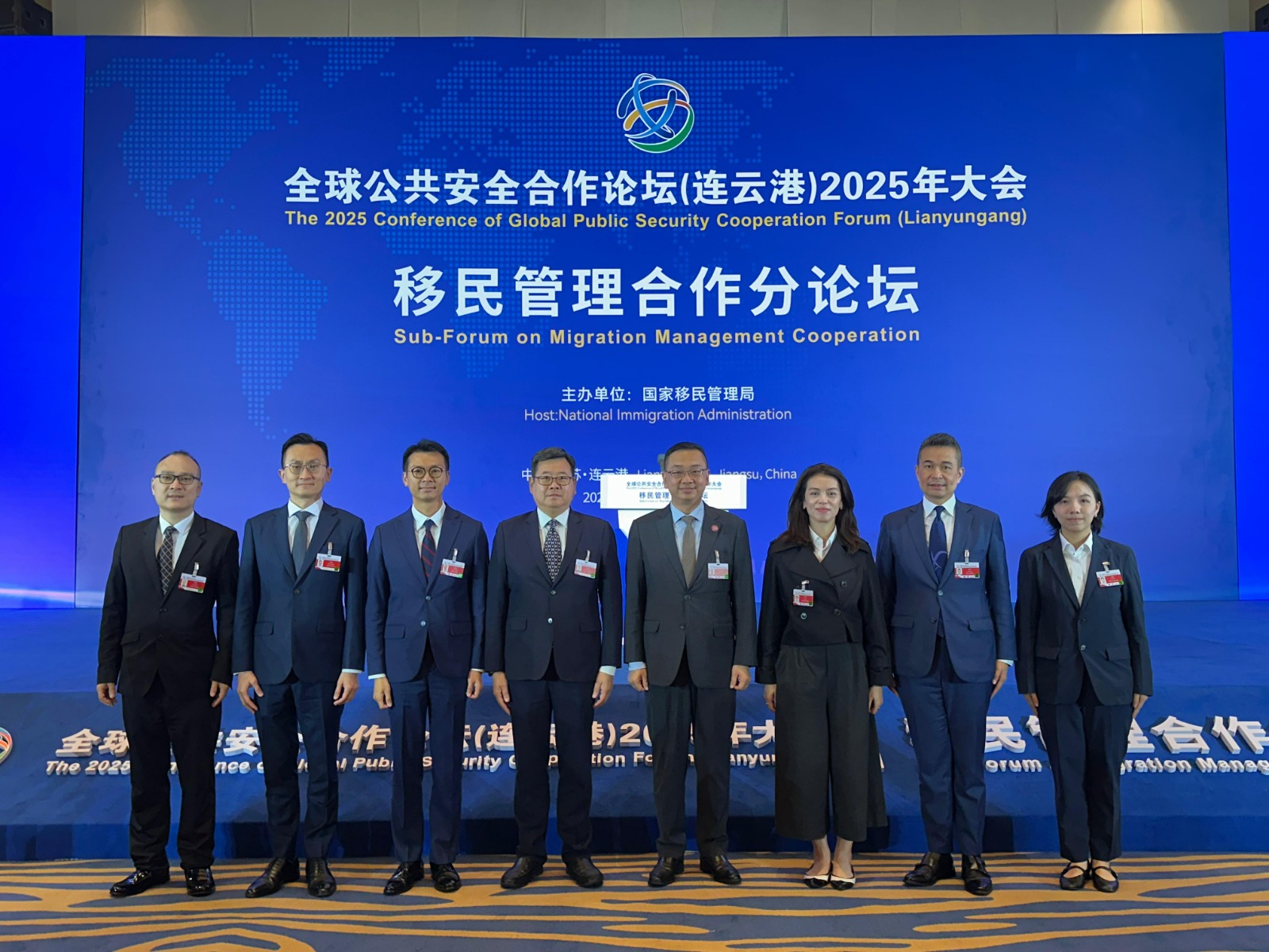 郭處長聯同樊助理處長於9月16日至18日率領代表團出席江蘇省連雲港市舉行的「全球公共安全合作論壇(連雲港)2025年大會」,以中國代表團成員身份參與主論壇、移民管理合作分論壇和區域移民治理政策研討會,與來自全球約120個國家、地區和國際組織近2000名嘉賓共同探討全球重要的公共安全議題。代表團成員在會上與多國執法機關、國際組織代表及專家學者,就出入境管理和吸引人才等多項議題進行深入交流。