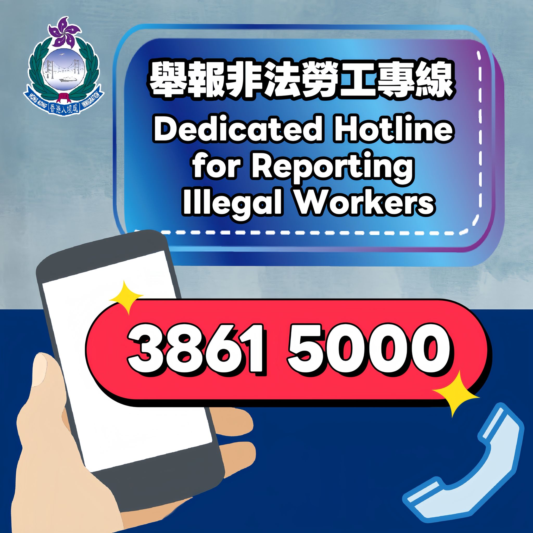 大家緊記❗ 在香港以任何方式從事非法工作,或貪便宜貪方便聘請非法勞工都是嚴重罪行,隨時要負上刑責。如發現懷疑非法勞工,請致電「舉報非法勞工專線」3861 5000。