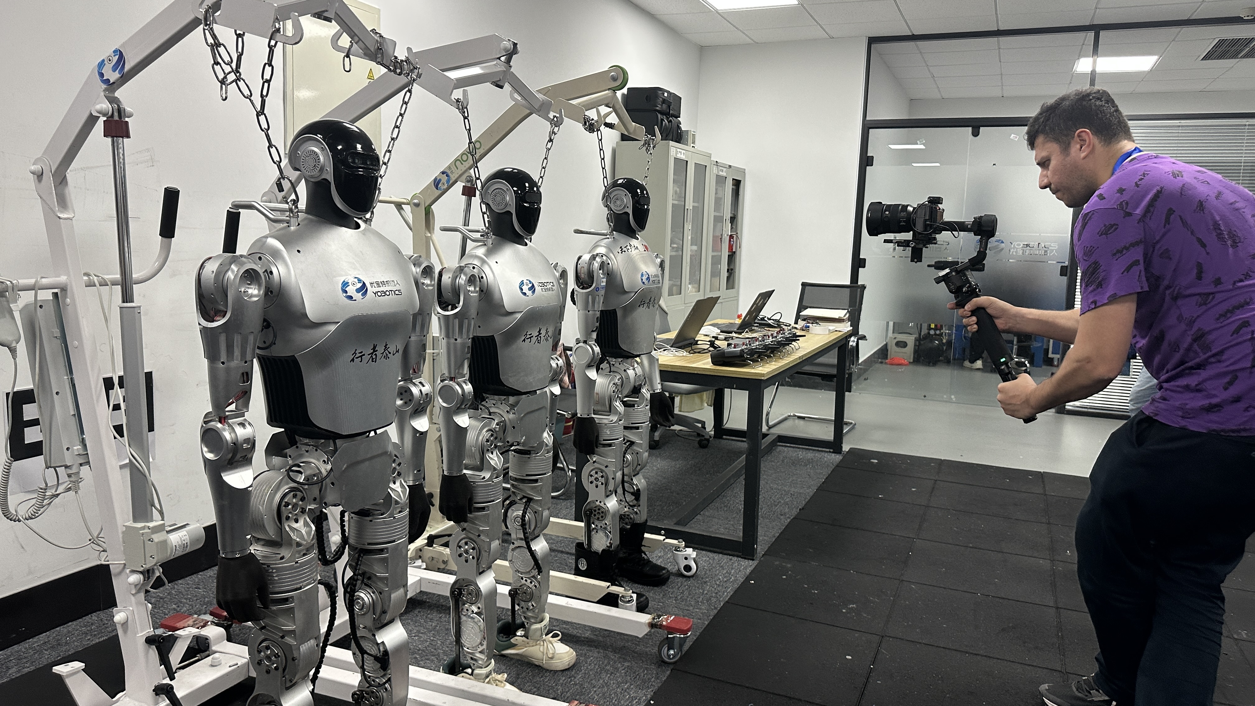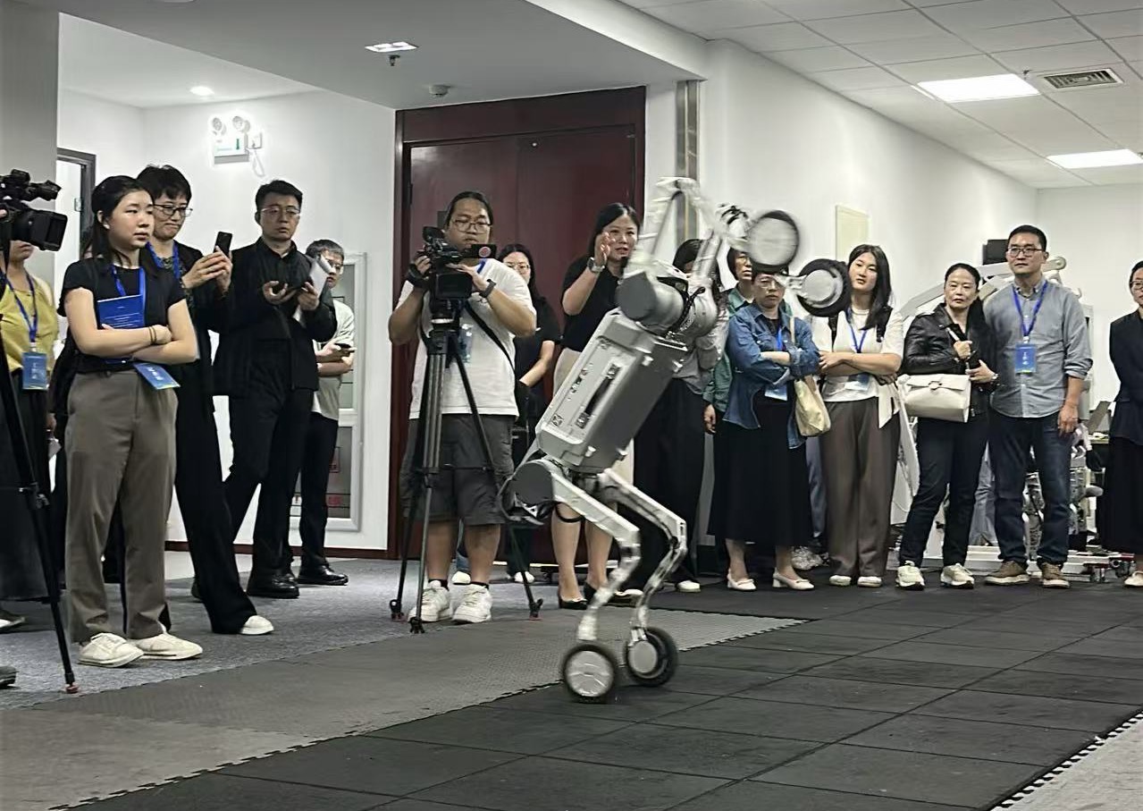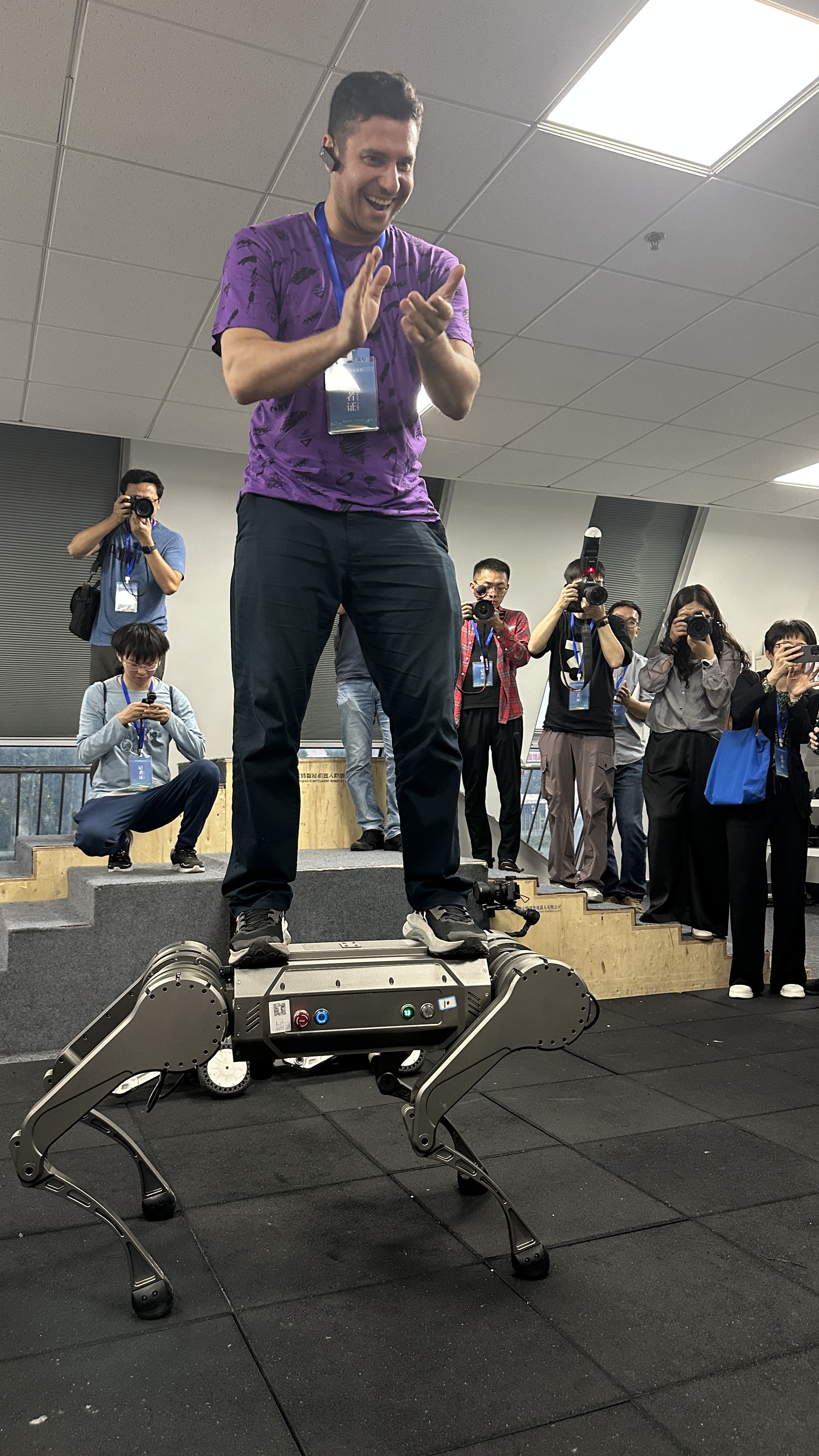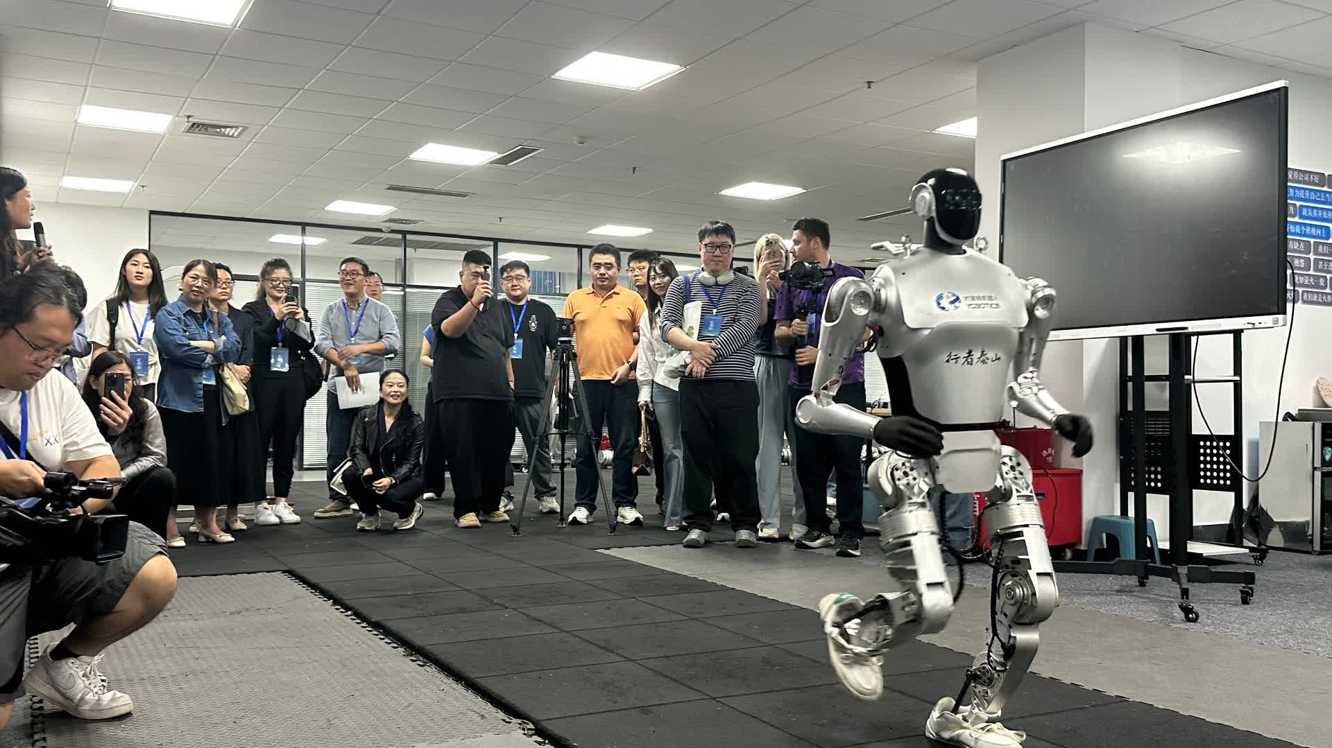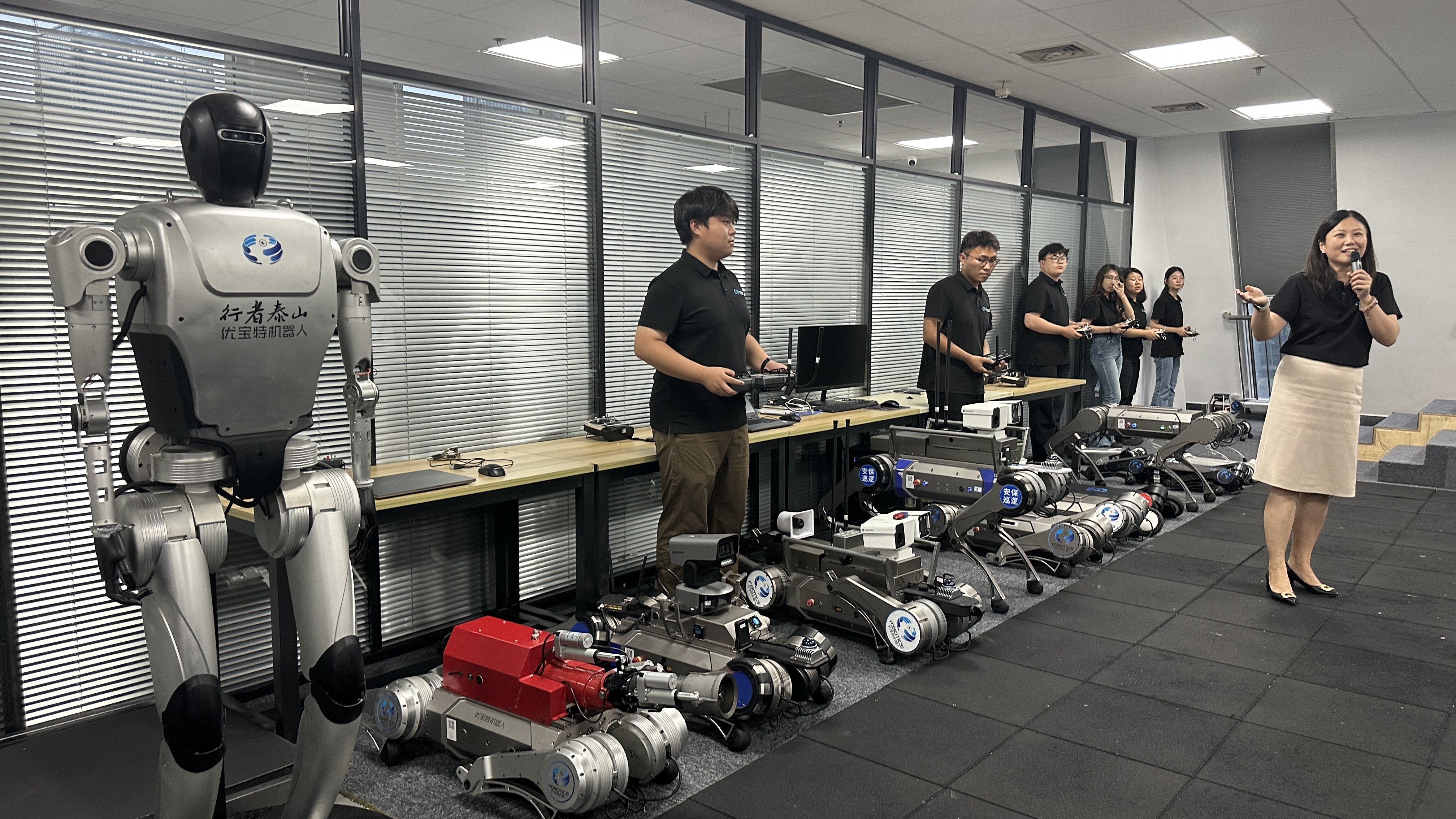 「Beautiful,Beautiful!」站在四足機器人背上,今日俄羅斯電視台記者Konstantin Kobaidze被穩穩升起,他忍不住鼓掌並連連稱讚。香港NOW寬頻電視記者楊佩詩更是騎在四足機器人上,邊走邊播報。行走、奔跑、攀爬、旋轉、負重、凌空翻……在山東優寶特智能機器人有限公司(以下簡稱「優寶特機器人」)測試區,人形機器人「行者泰山」與一眾腿足式機器人的精彩炫技,讓中外記者們目不暇接。