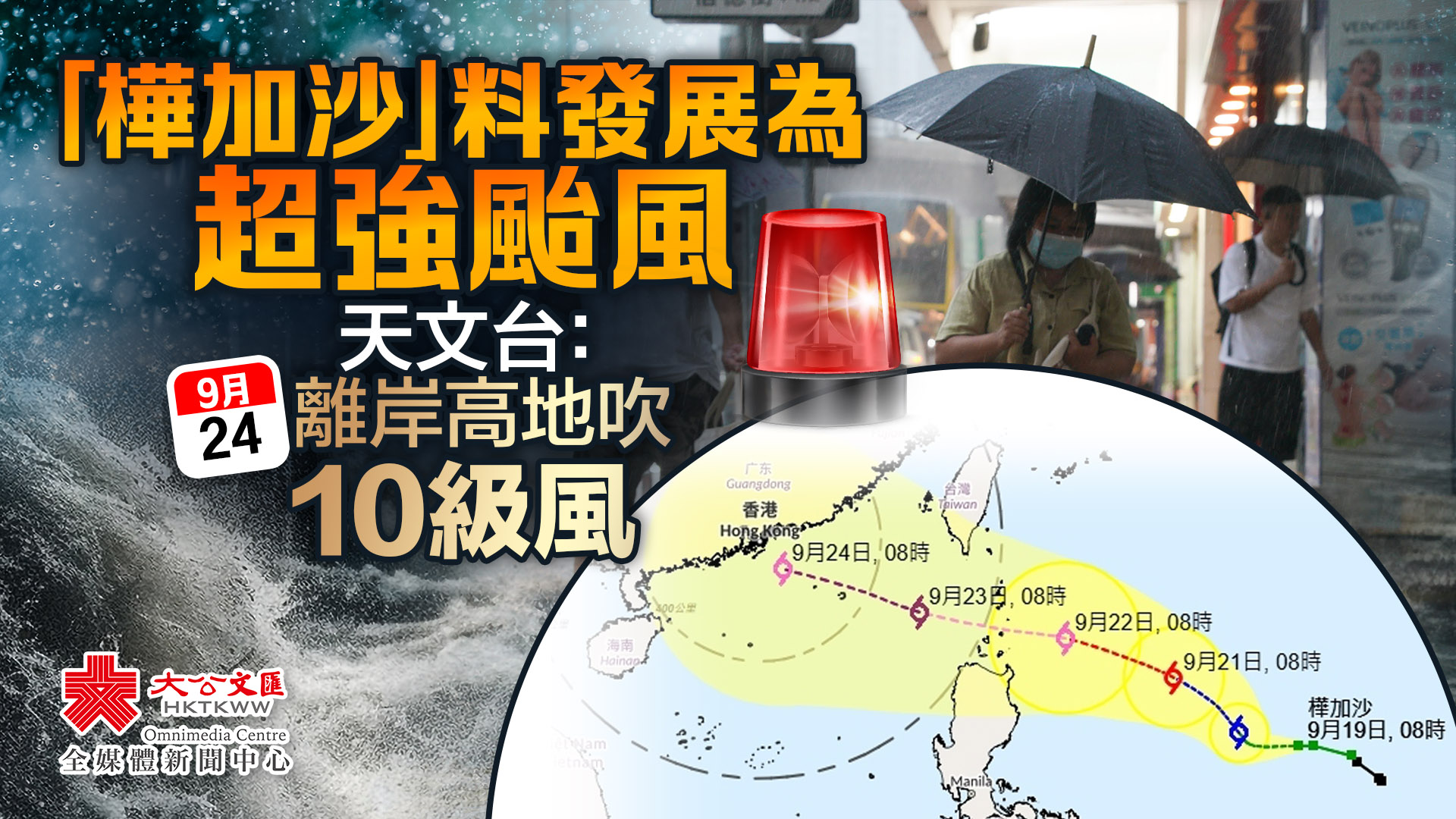 大公文匯全媒體報道,熱帶風暴「樺加沙」持續增強,預計將發展為超強颱風,並於下周三至四(24至25日)正面吹襲珠江口一帶。天文台今早(19日)更新預報,指「樺加沙」將於下周三早上移至香港以南約100公里,雖略為減弱至強颱風級別,但中心附近最高持續風速仍高達每小時175公里,對本港構成嚴重威脅。