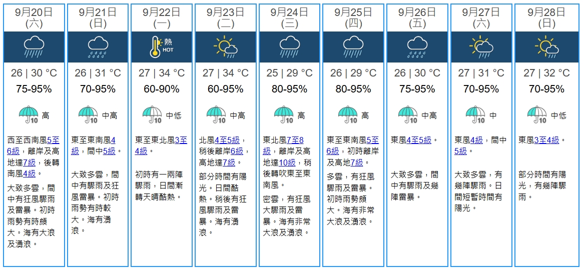 下周四(25日)風勢稍緩,吹東至東南風5至6級,初時離岸及高地達7級,仍多雲有狂風驟雨及雷暴,雨勢初時頗大,海面繼續有非常大浪及湧浪。預計下周五(26日)起天氣逐漸好轉,風力減弱,驟雨減少。周末期間短暫時間有陽光,氣溫回升,最高可達32度。