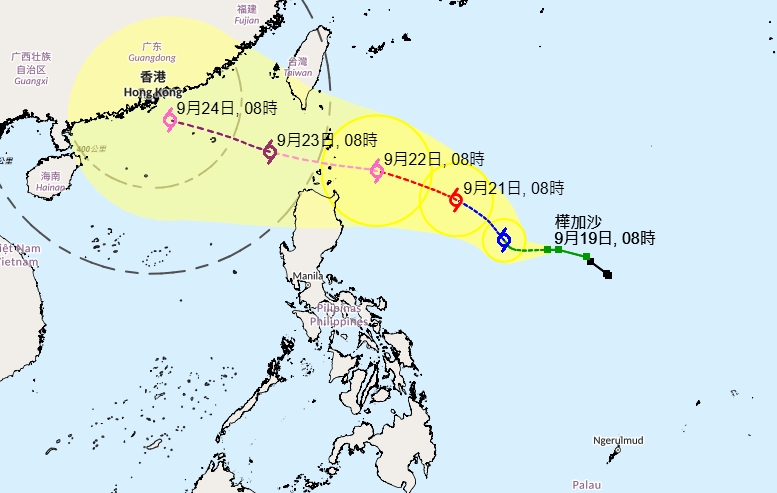 「樺加沙」預料於下周二(23日)早上進入香港東南約600公里範圍,並達至超強颱風級別,風速高達每小時195公里。之後它將維持西北偏北路徑,趨向珠江口,當晚進入本港東南約400公里,仍維持超強颱風強度。