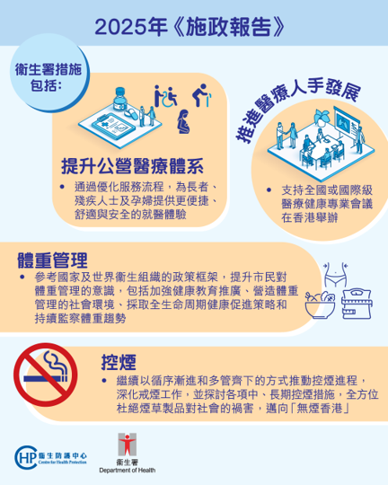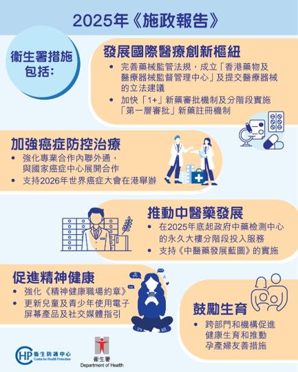 《行政長官2025年施政報告》內由衞生署協助推動的措施包括: