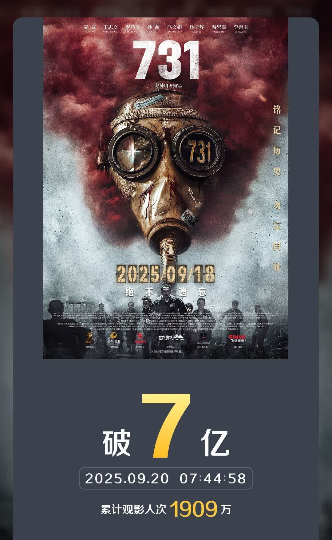 《731》於9月18日在全球多地上映,19日,在美國、加拿大上映。