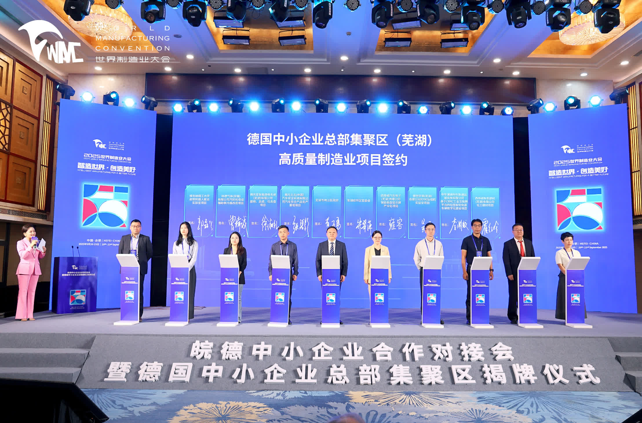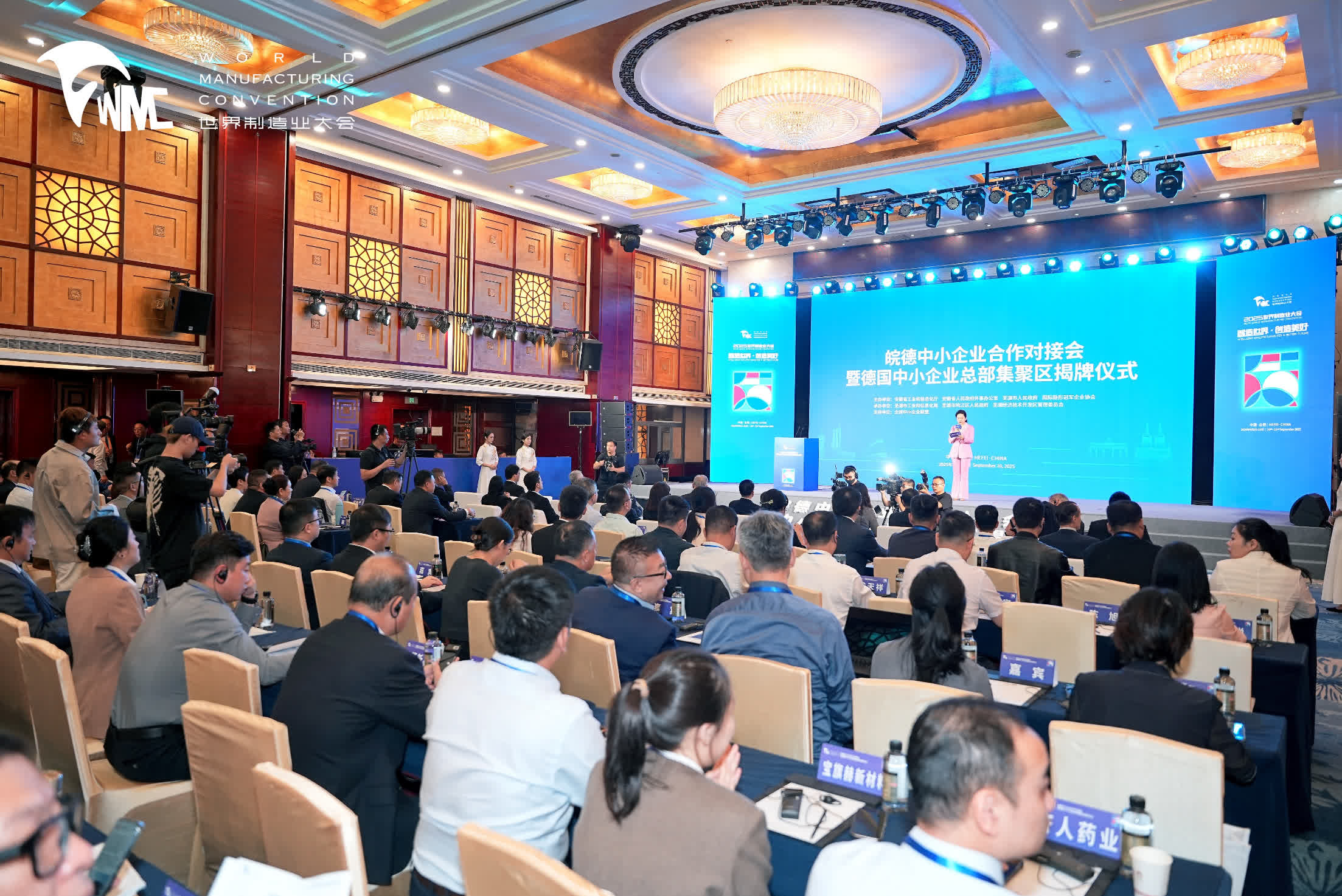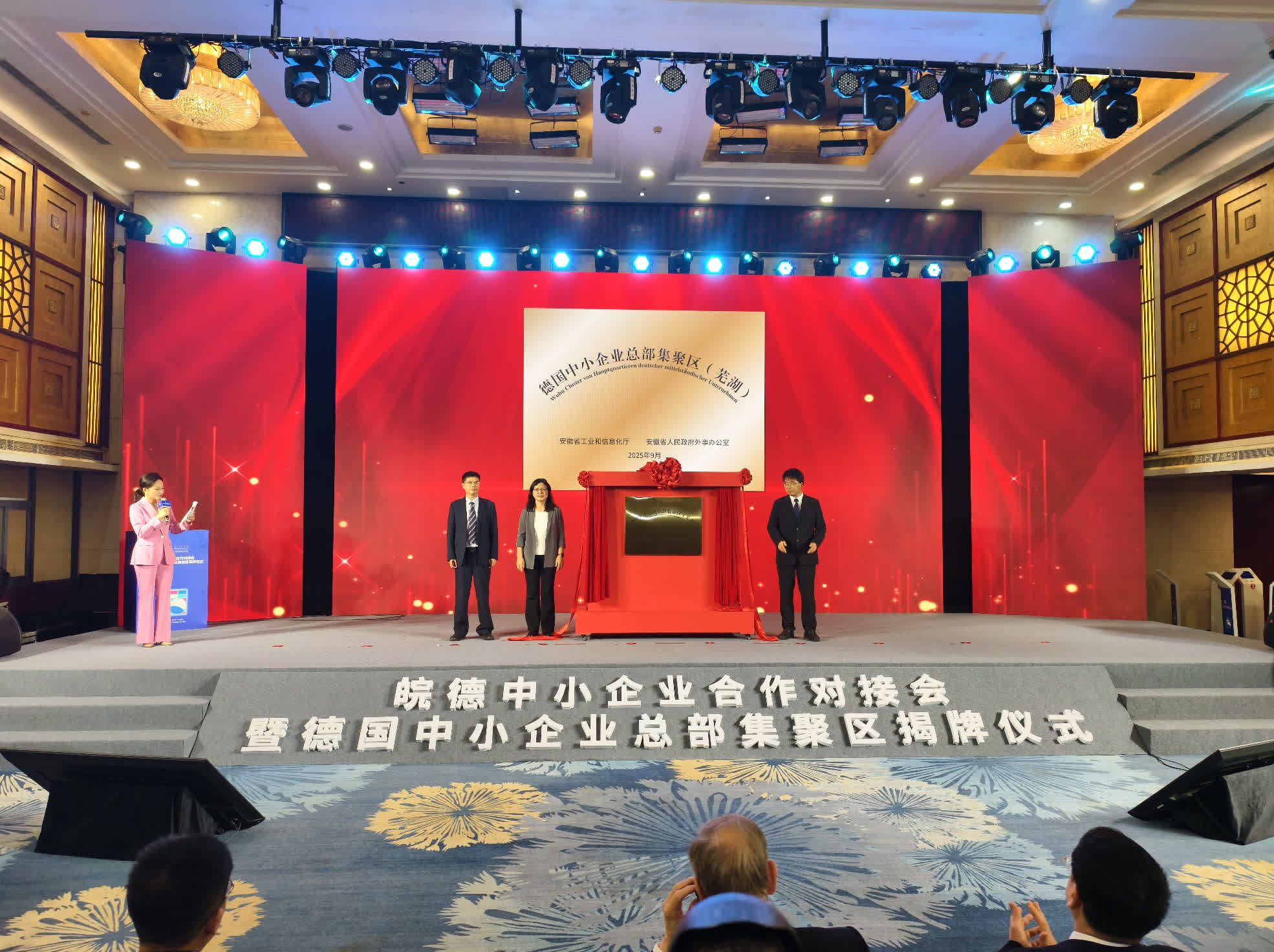 9月20日,2025世界製造業大會皖德中小企業合作對接會在安徽省合肥市舉行,來自皖德的政府、協會、高校、企業及智庫代表約200人參會。會上,安徽省工業和信息化廳、安徽省人民政府外事辦公室、蕪湖市人民政府共同為德國中小企業總部集聚區(蕪湖)揭牌。