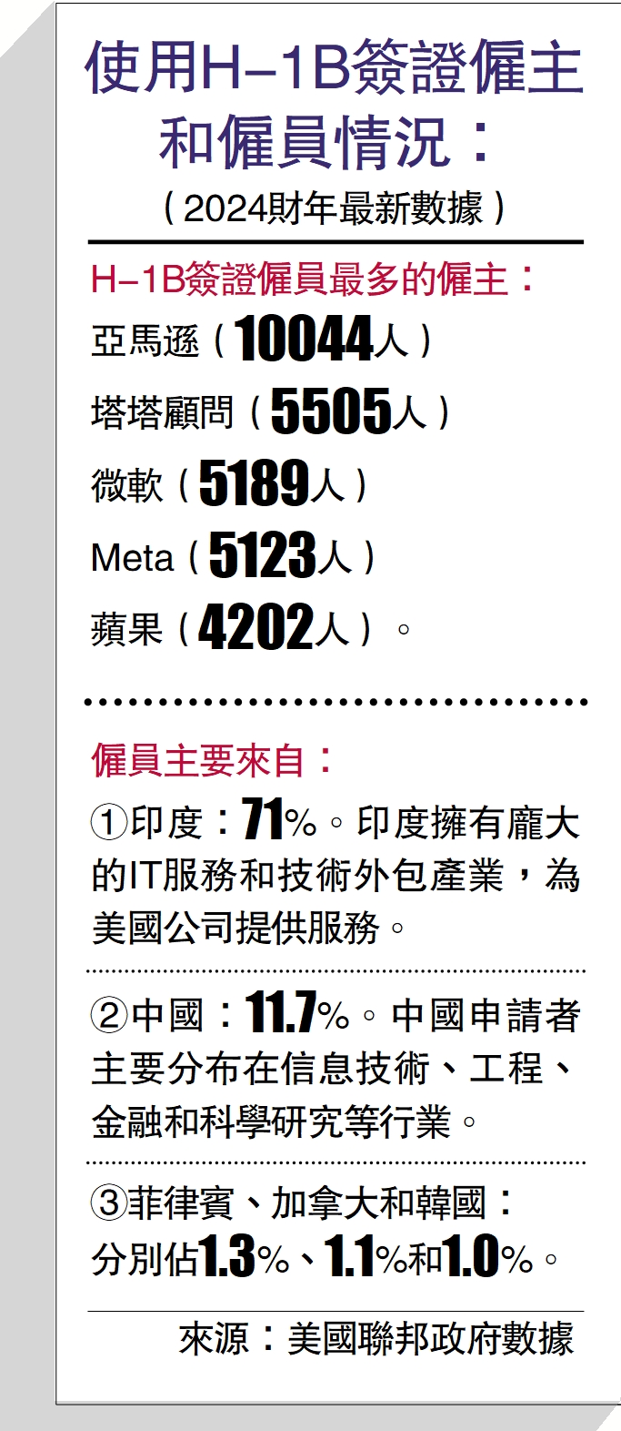 印度是H-1B簽證的最大受益國。美國公民及移民服務局(USCIS)最新數據顯示,2024財年印度籍申請人約佔H-1B簽證獲批總額的71%。這些印度籍員工主要是受僱於美國IT企業的專業人才。美國諸多科企為節省成本,將客服中心、編程及其他基礎業務外包給塔塔諮詢等印度諮詢公司。這些諮詢公司僱用印度員工,再將他們外派至美國本土工作。