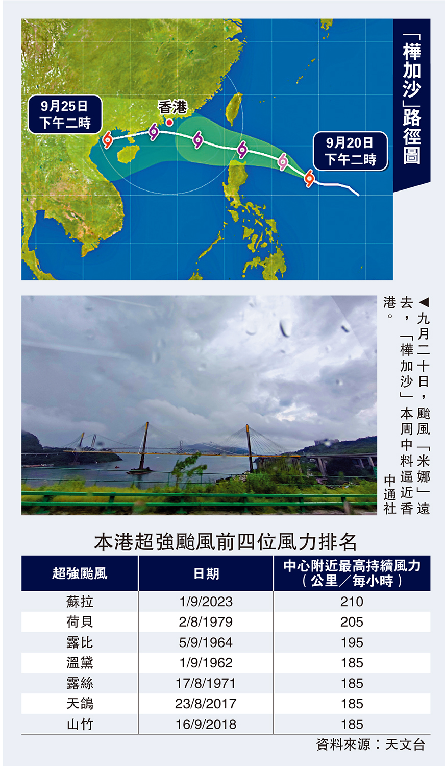 天文台昨日公布最新預測移動路徑圖顯示,「樺加沙」將於周三早上,在天文台以南約80公里的珠海市佳蓬列島以南海域,以超強颱風級別掠過,中心附近最高持續風速達每小時185公里,較前晚(19日)向南推約30公里,相比2018年襲港的超強颱風山竹最近香港時100公里,再近20公里。