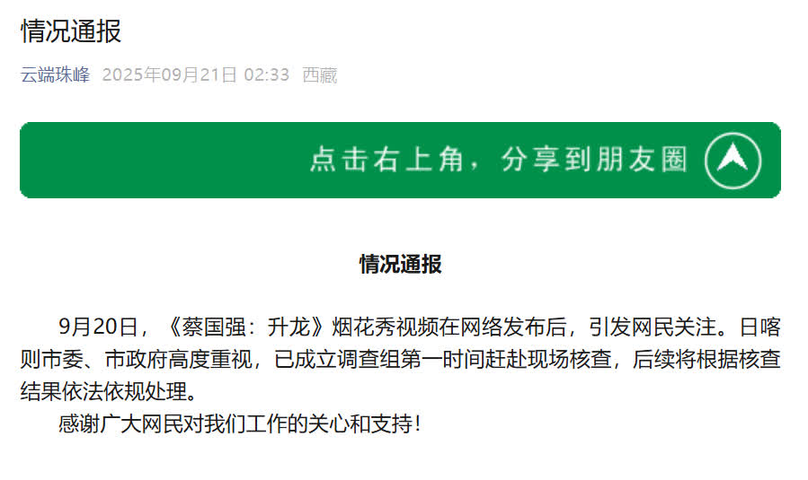9月20日,《蔡國強:升龍》煙花秀視頻在網絡發布後,引發網民關注。日喀則市委、市政府高度重視,已成立調查組第一時間趕赴現場核查,後續將根據核查結果依法依規處理。