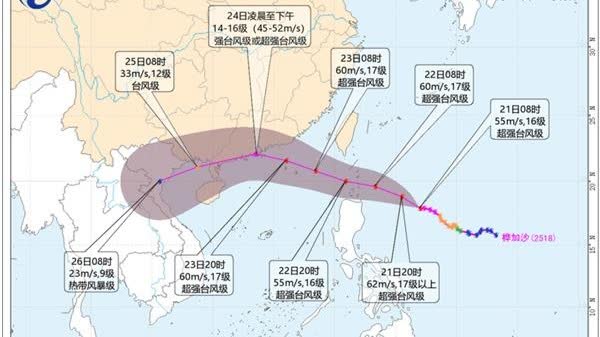 據中國天氣網報道,今年第18號颱風「樺加沙」已於今天(9月21日)上午加強為超強颱風級,上午8點鐘其中心位於菲律賓馬尼拉東偏北方向約740公里的西北太平洋洋面上,就是北緯17.9度、東經127.0度,中心附近最大風力有16級(55米/秒),中心最低氣壓為930百帕,七級風圈半徑300-350公里,十級風圈半徑150-180公里,十二級風圈半徑80-120公里。