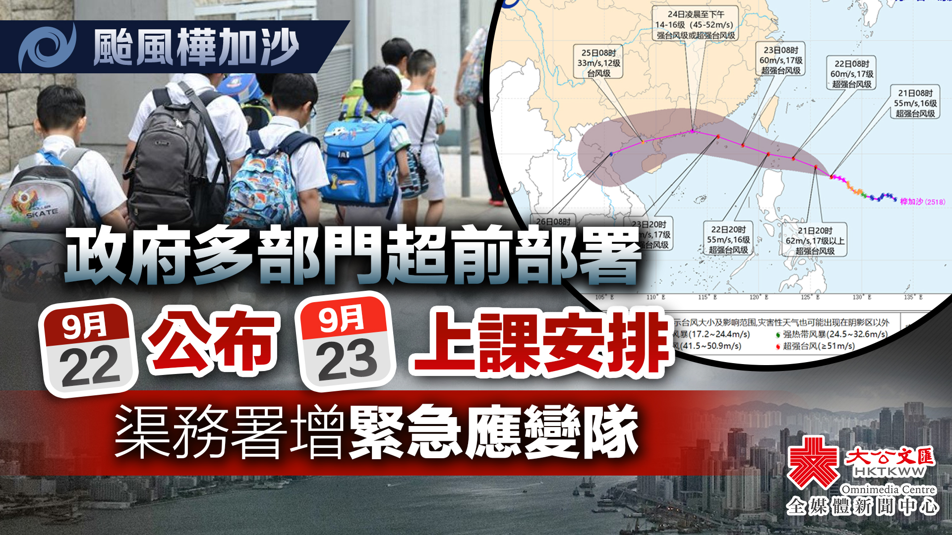 教育局會密切留意天氣情況,並按天文台明日(9月22日)最新的評估及預測,在明日稍後時間公布有關9月23日學校上課及提交2026年度小一入學自行分配學位紙本申請的相應安排,讓家長和學生早作準備。市民請密切留意教育局的公布。
