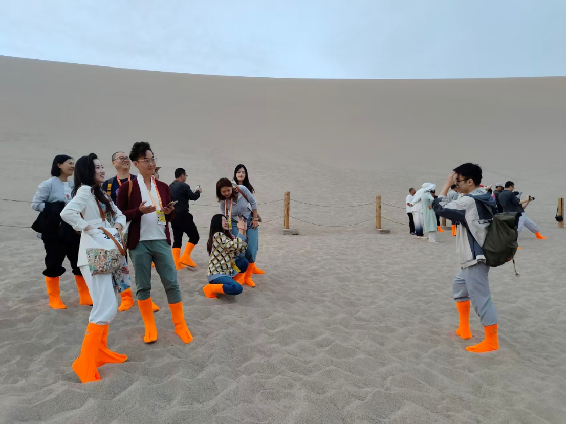「這個沙丘在夕陽下好美啊……」傍晚,載着香港網絡名人的車輛正駛向鳴沙山,透過車窗望見金色沙海的眾人,紛紛舉起手機定格眼前景致。9月20日,「香港網絡名人走進敦煌文博會」活動來到了敦煌標誌性的人文景觀——鳴沙山月牙泉,讓來自香江之畔的訪客邂逅「塞外風光之一絕」。