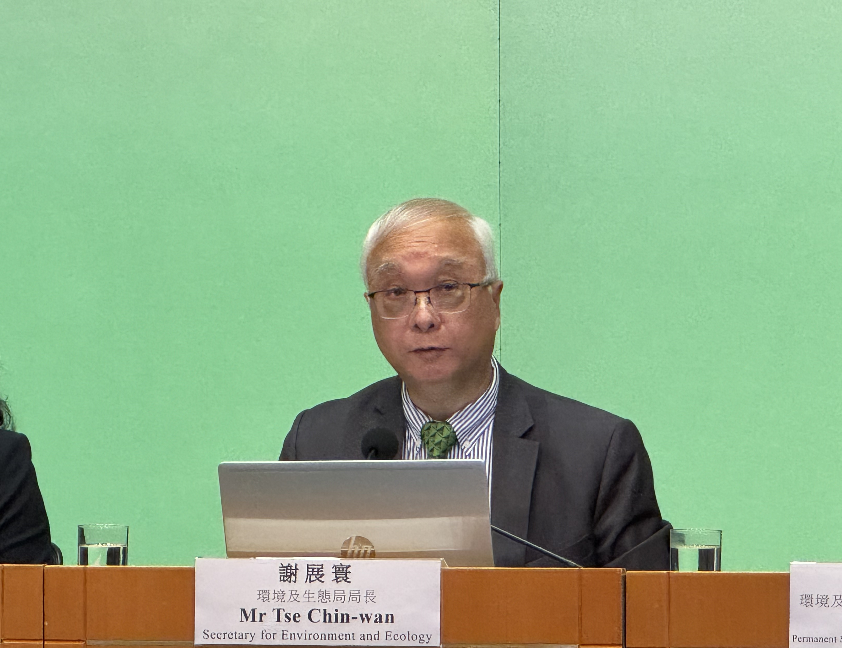 謝展寰講解該局正在進行及接下來將進行的政策措施,分別從支援中小企、推廣寵物友善、推動食品產業發展、漁農業可持續發展、加快處理樓宇滲水、推動共建「一帶一路」綠色合作、推動新能源產業發展、打造綠色科技示範基地、為環境保育增值及邁向「零廢堆填」等方面着手。